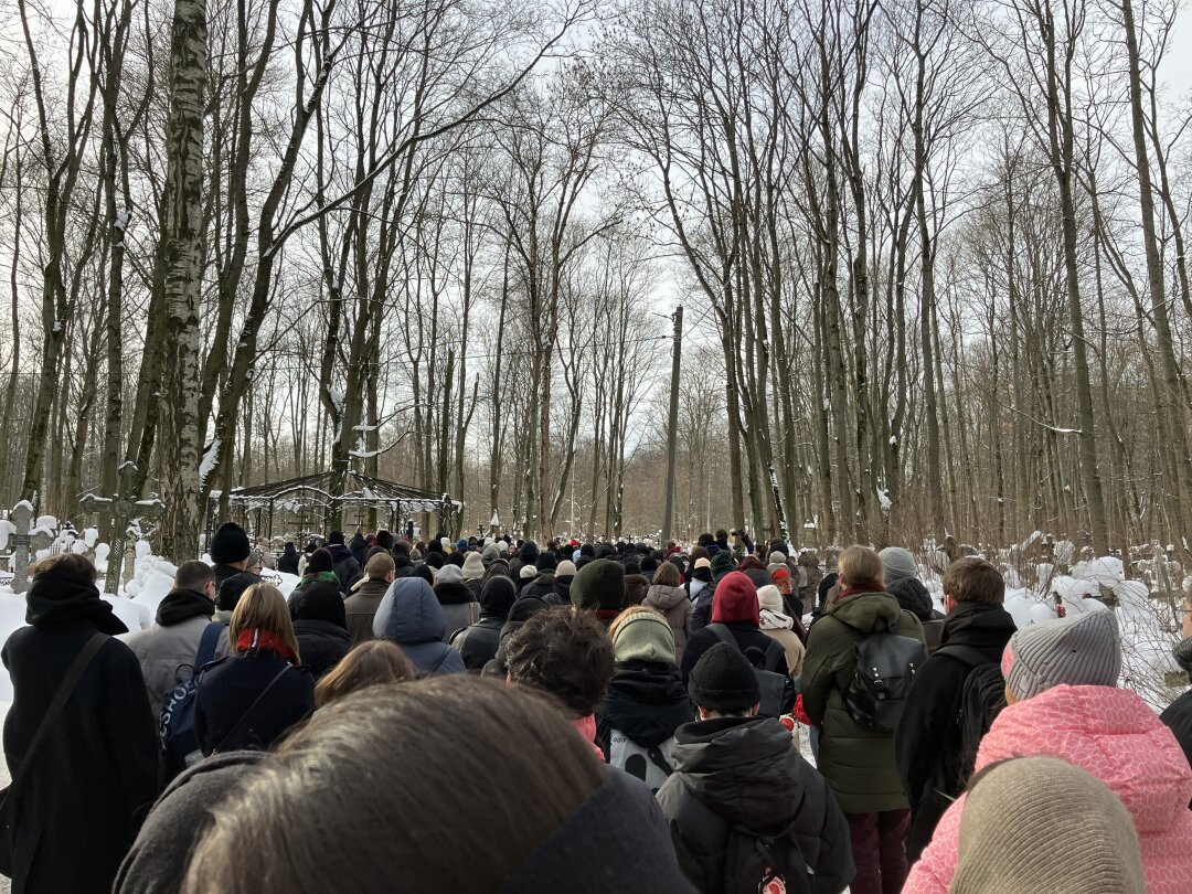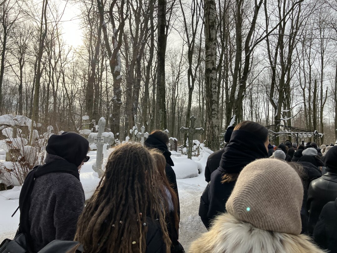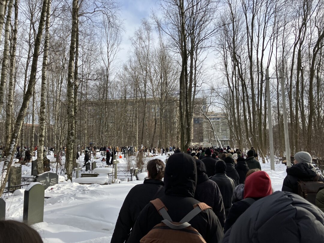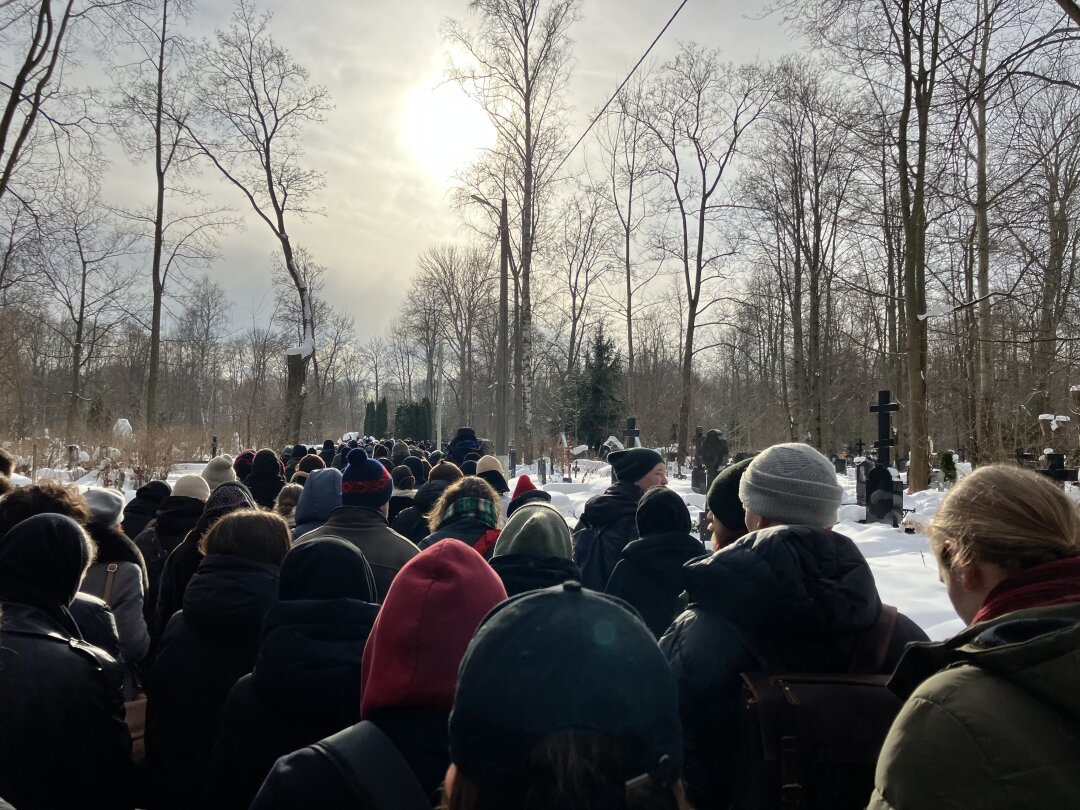 Процессия продолжается на Смоленском кладбище: в 13:55 к Киевской дорожке, вблизи которой вырыли могилу, уже не подойти. Людей, вероятно, меньше, чем в храме, но, пробираясь между надгробиями, толпа становится все плотнее.