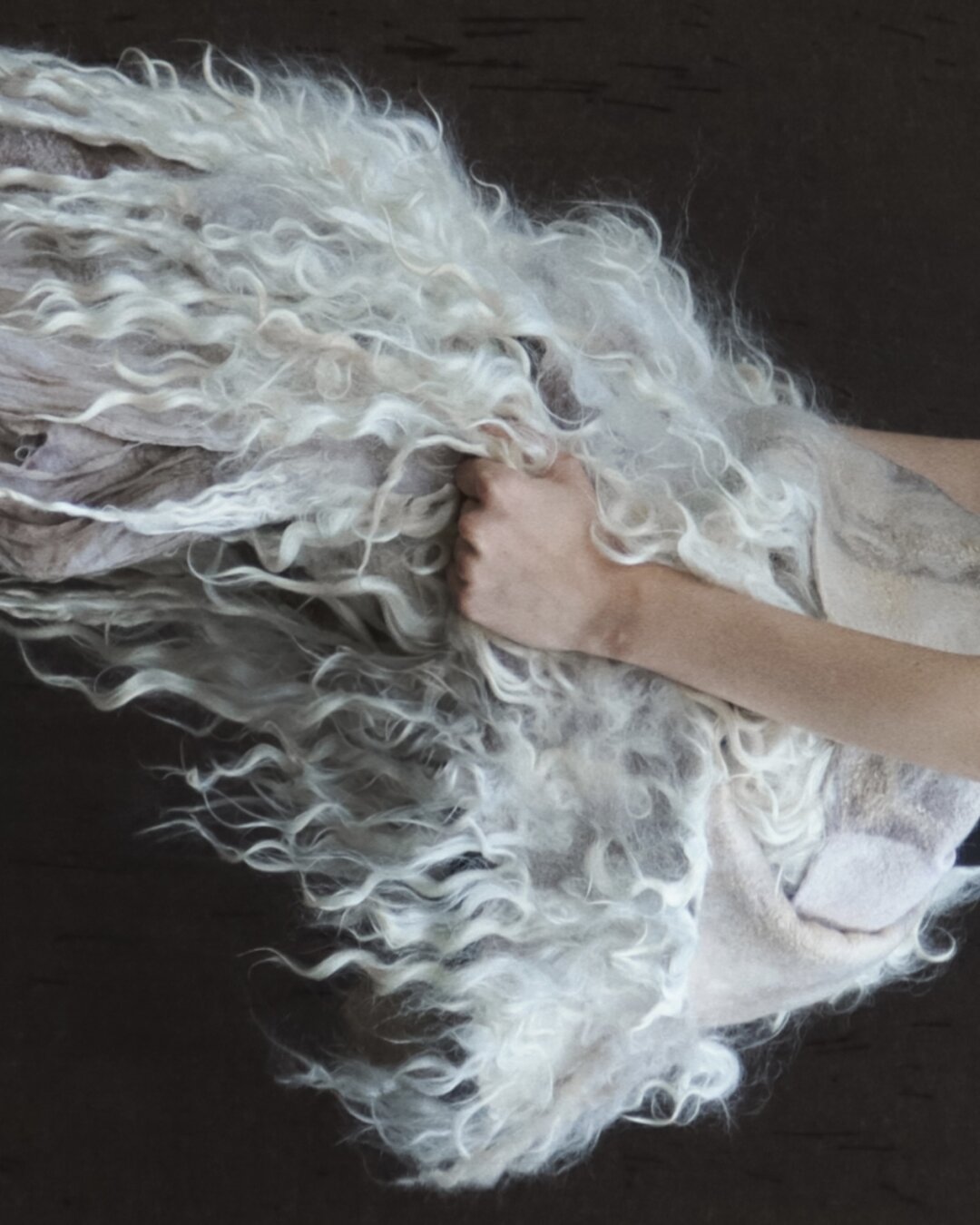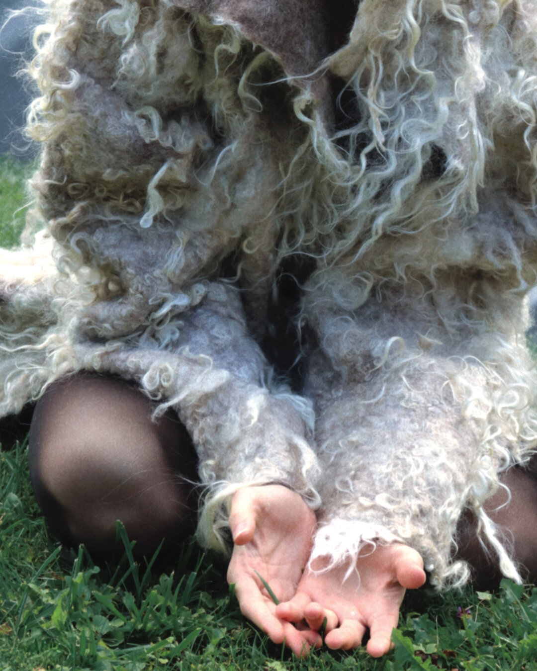 Я все время нахожусь в поиске форм. Сначала это действительно был лен, потом шелк: в 2023 году у меня вышла капсульная коллекция «Кокон», посвященная мотылькам-шелкопрядам. Если помните, тем летом они буквально заполонили город – однажды мотылек сел мне на юбку и таким образом «дошел» со мной до самого дома. Меня так впечатлило это, что я решила создать целую серию вещей. Все они были выполнены из шелка и, наслаиваясь друг на друга, имитировали крылья мотыльков. А прямо сейчас мой любимый материал – войлок, работаю преимущественно с ним.