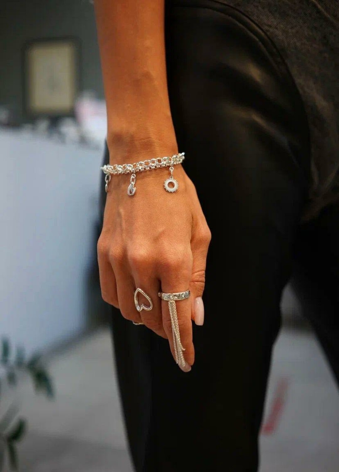 Вспоминаем первую звездную роль Марго Робби и образы роковых красоток из восьмидесятых: коктейльное голубое платье, кружевные комплекты, туфли-лодочки и массивная бижутерия. А цепи-лямки черного платья Наоми Лапальи мы бы мэтчили с кольцом на нижнюю фалангу с цепочками. В Sens такой вариант есть в серебряном и золотом цветах. Фактурное украшение можно как носить самостоятельно, так и экспериментировать с тяжелым обвесом — сочетать сразу с несколькими другими кольцами бренда и не скромничать (чем больше, тем лучше!).