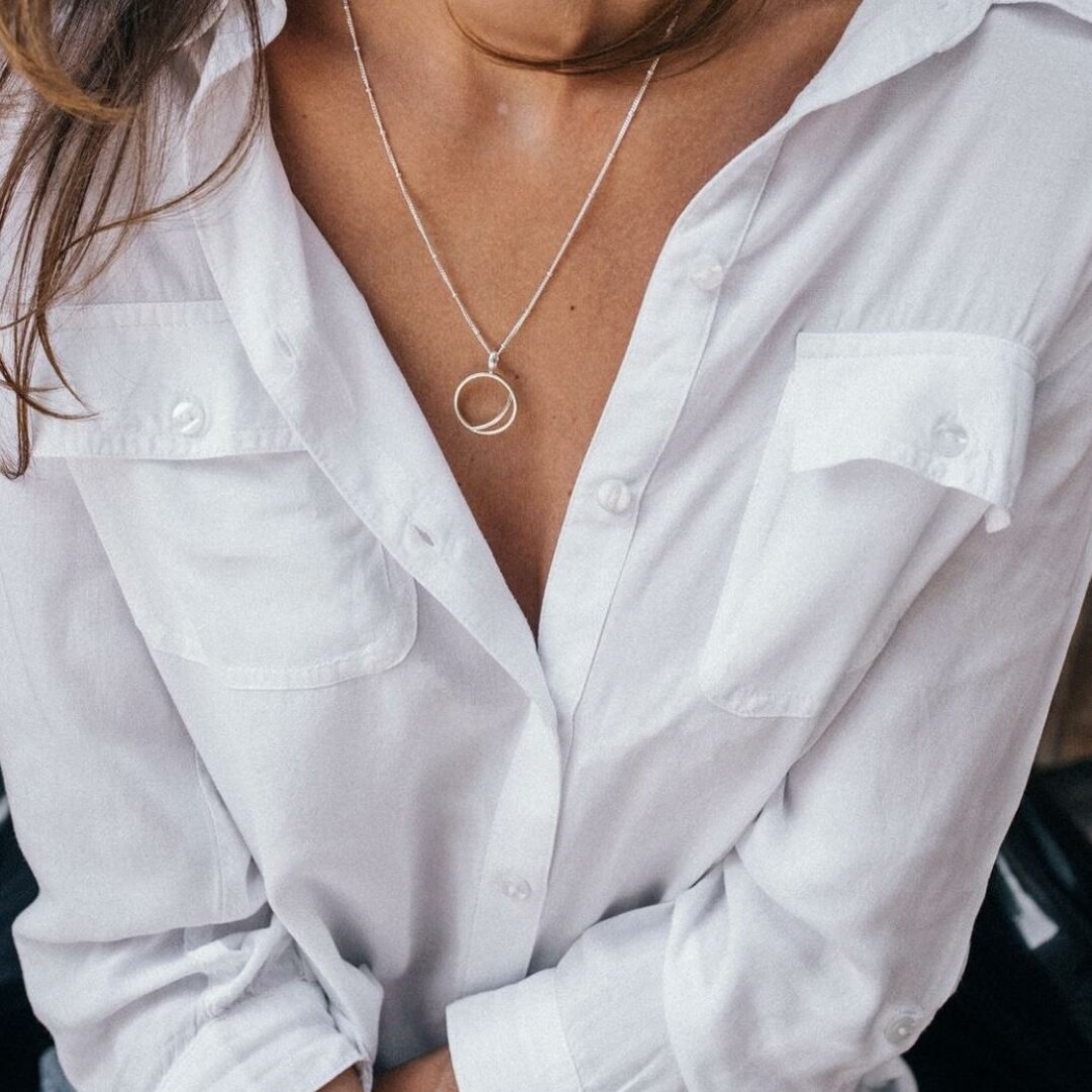 Как комбинировать ретро с современными украшениями, можно подсмотреть у героини Блейк Лайвли из «Века Адалин»: по сюжету она перестает стареть и в течение ста лет меняет имена и образы, чтобы не выдать свой настоящий возраст. Так в фильме у нее формируется эклектичный стиль — она носит платья из 20-х с заниженной талией и кардиганы из 90-х. А вот в образе с замшевым пальто, кашемировым свитером и маленькой сумочкой мы видим подвеску, очень напоминающую по своей форме украшение из магазина Sens. Серебряное колье Soul с фактурной подвеской в виде расходящихся лучей можно также комбинировать с кольцом-печаткой. Если брать за референс образ Адалин, то носим колье поверх винтажного свитера, а летом с открытыми плечами и глубокими вырезами.