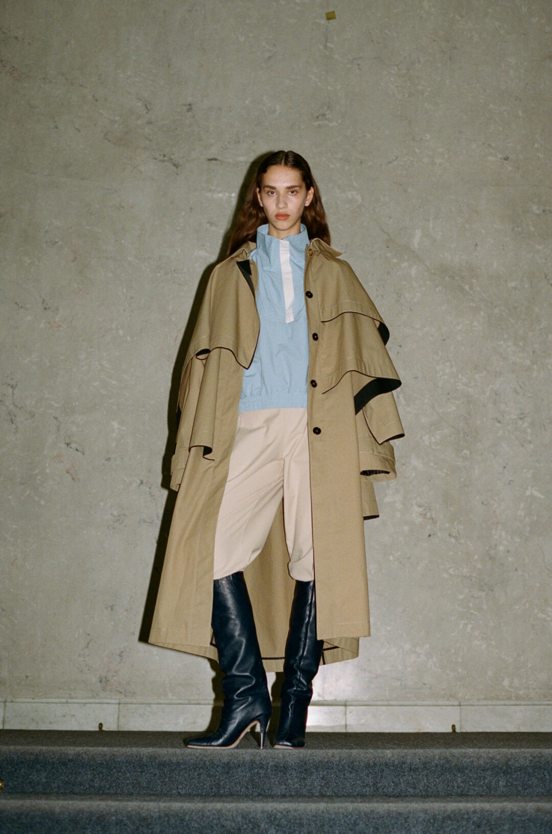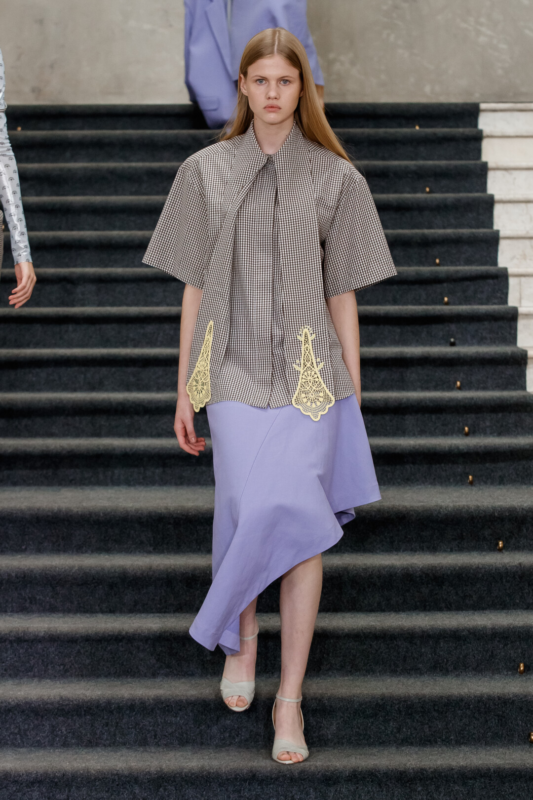Так тонкое вязаное кружево, напоминающее ажурную вышивку нарядных деревенских полотенец, становится украшением подолов юбок, рубашек и жакетов. Особый способ, которым олясяй повязывала платок, чтобы тот «квадратом» спадал на спину, угадывается в струящихся фалдах тренчей и платьев.