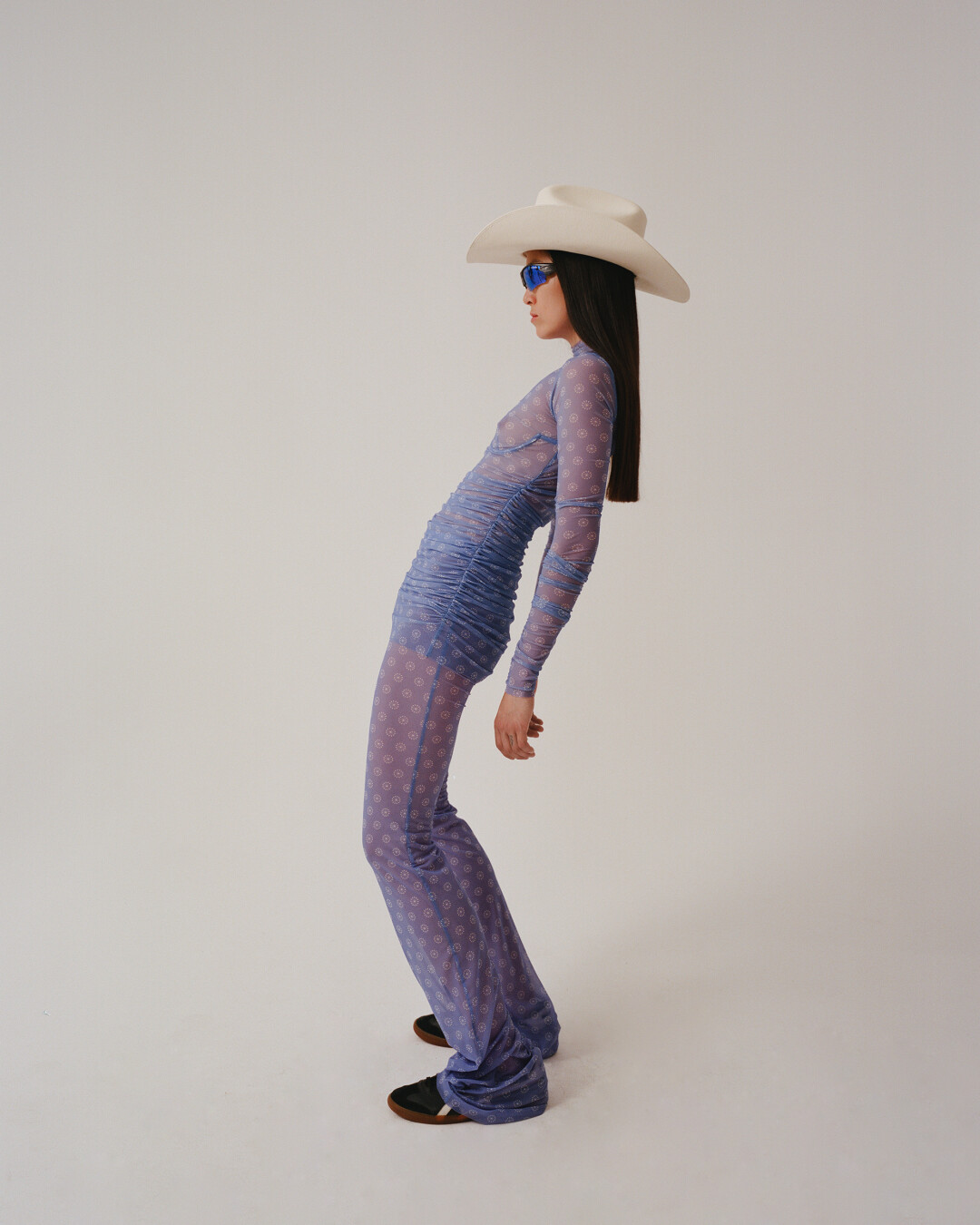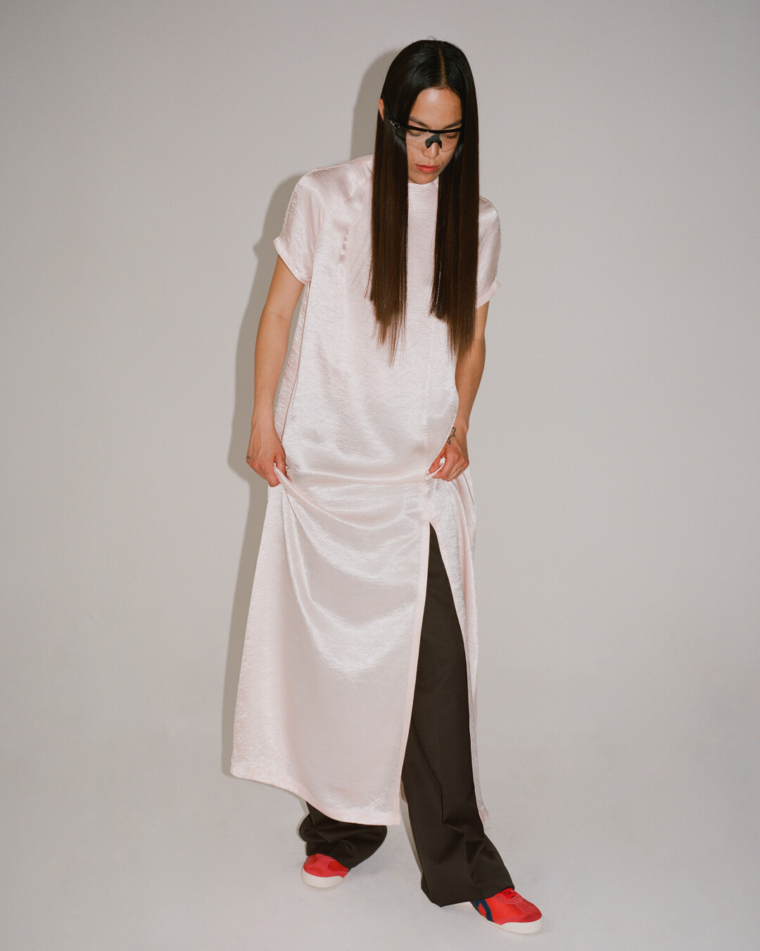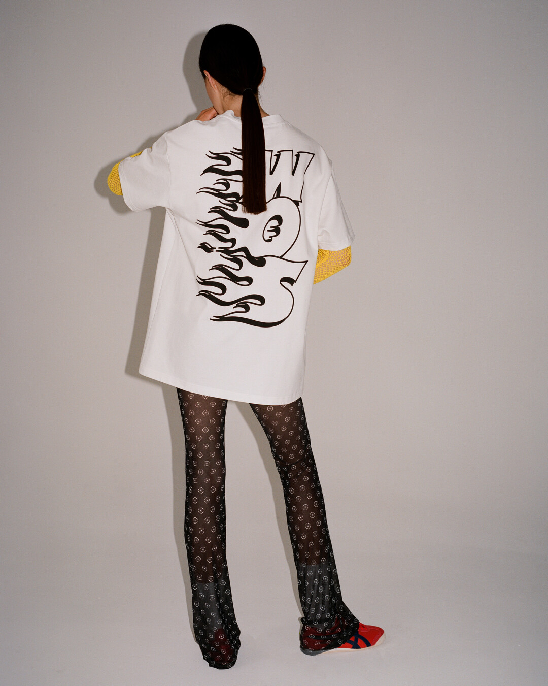 Одним из самых заметных референсов в коллекции стала мода современного Ближнего Востока: отсюда сочетание платьев с шароварами и многослойные образы, где лонгсливы из сетки комбинируются с оверсайз-футболками. «Я смотрел, как девушки в ближневосточных странах носят и миксуют спортивную одежду с элементами традиционного национального костюма», – рассказывает дизайнер Андрей Артемов.