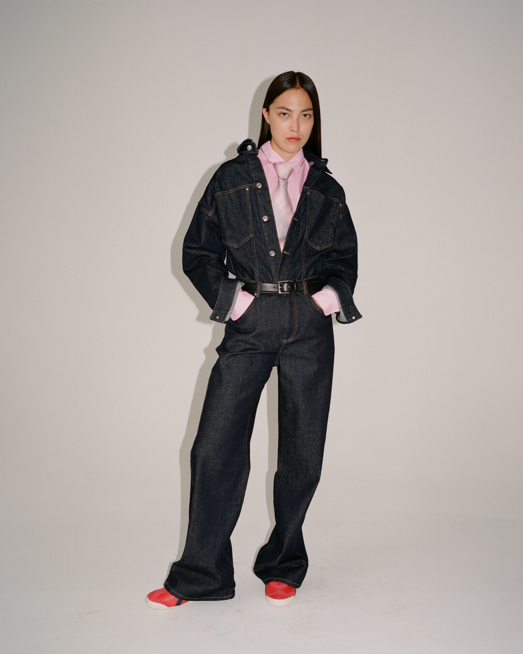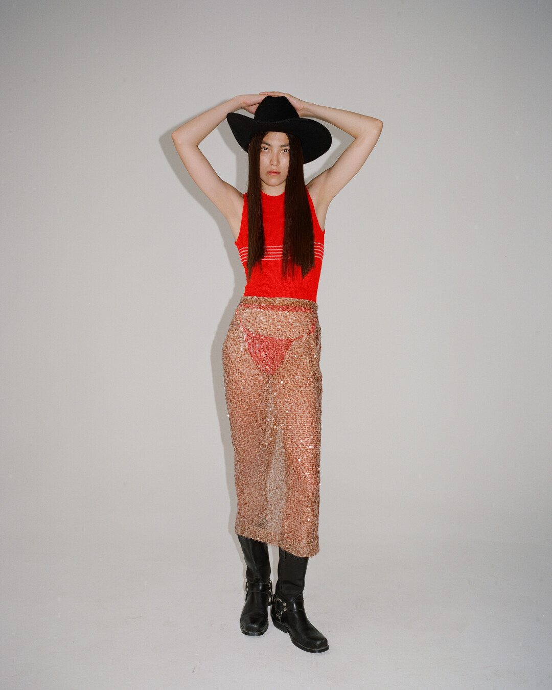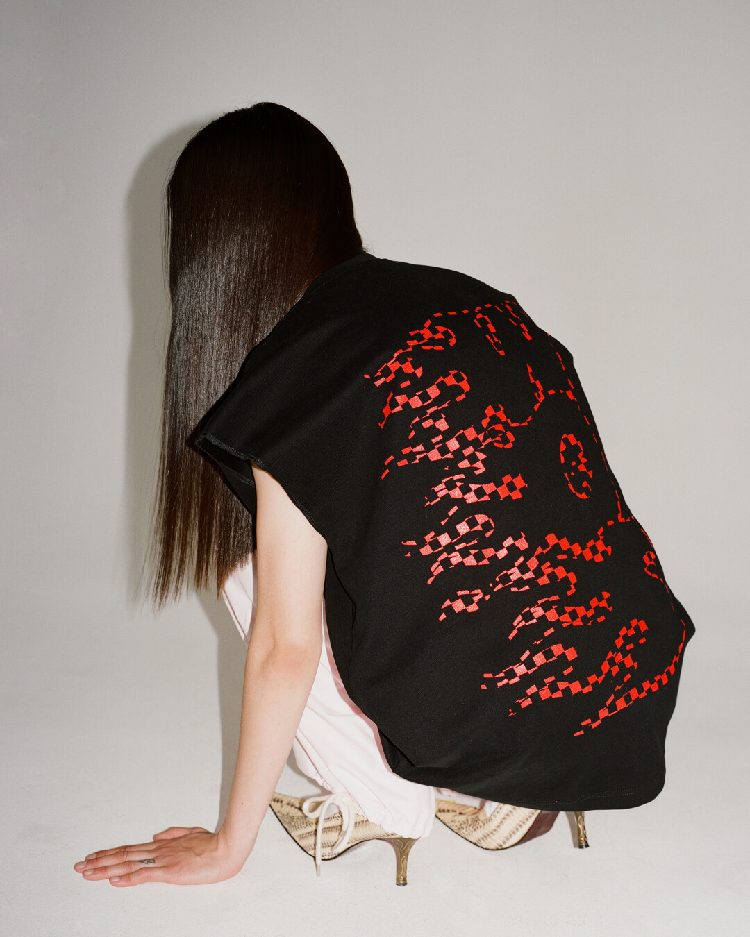 Одним из самых заметных референсов в коллекции стала мода современного Ближнего Востока: отсюда сочетание платьев с шароварами и многослойные образы, где лонгсливы из сетки комбинируются с оверсайз-футболками. «Я смотрел, как девушки в ближневосточных странах носят и миксуют спортивную одежду с элементами традиционного национального костюма», – рассказывает дизайнер Андрей Артемов.