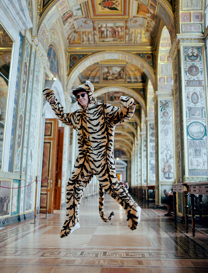 Появление чемпиона мира по кайтсерфингу Петра Тюшкевича на склонах Куршевеля или в залах Эрмитажа в костюме плюшевого тигра — это настоящий перформанс. То, как он стирает грань между искусством и действительностью в поисках новых способов художественного выражения, означает акционизм в чистом виде — форму высказывания, основанную на радикальном и несакционированном действии в общественном месте, для неподготовленной к этому аудитории.