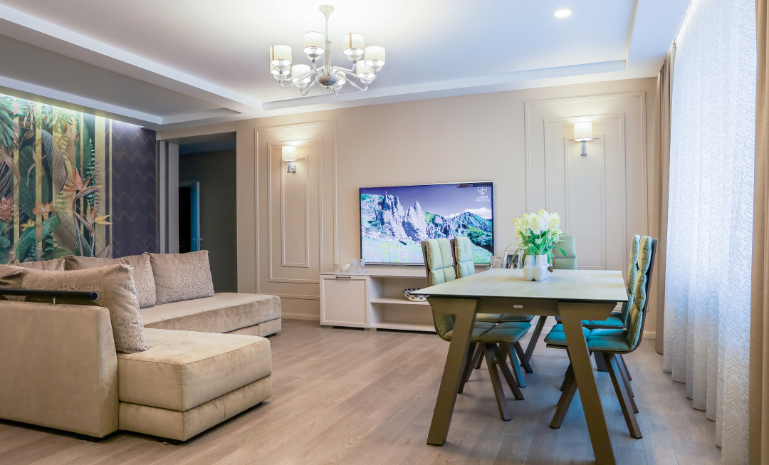 Хозяйка этой квартиры — настоящая Мама, которая успевает обо всех позаботиться, всех накормить, везде навести порядок и готова каждый день принимать гостей. Создавая интерьер для этой семьи, дизайнер Светлана Тимербаева выделила главное: много свободного пространства, удобная и функциональная кухня, уютные спальни, надежные и долговечные материалы и общий стиль — мягкий и теплый, с яркими природными мотивами, чтобы напоминать об экзотических странах, где любят отдыхать все члены семьи. Светлана полностью пересмотрела планировку — небольшая кухня, просторная гостиная и три спальни, каждая с отдельным санузлом — для хозяев, их дочери и гостевая.