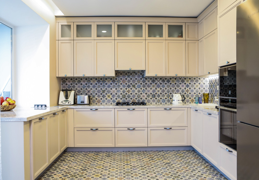 Кухонный гарнитур выполнен по последним тенденциям: современная классика, рамочные фасады с двойной фрезеровкой. Главным элементом стала широкая столешница, на которой удобно раскатывать тесто и готовить несколько блюд одновременно. При ее производстве специалисты отдали предпочтение кварцу – особому материалу, обладающему теплостойкостью и износоустойчивостью. Интерьер украшают эстетичные и качественные полотна.