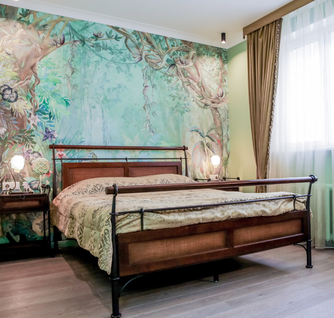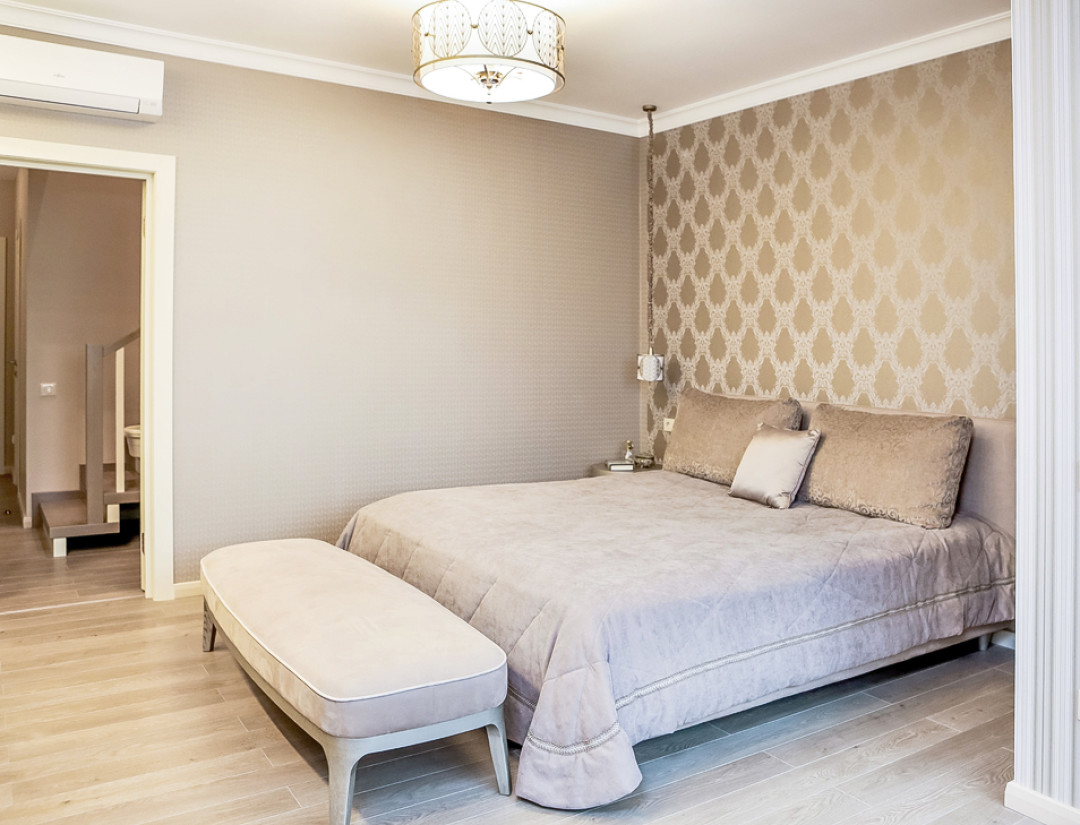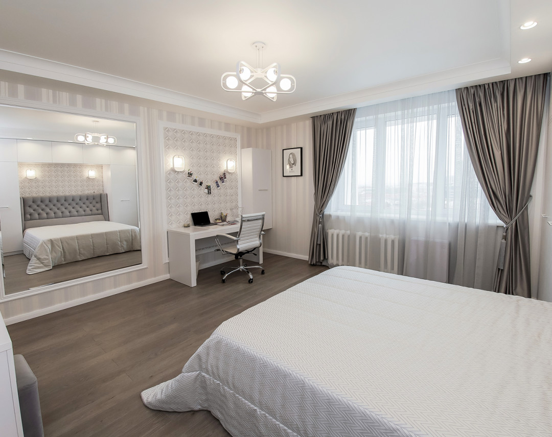 Для каждой из уютных спален подобрали тюли и шторы. К примеру, в спальне дочери висят шторы из ткани с атласной фактурой, которые перекликаются по цвету с изголовьем кровати. И дополнением, и гармоничным завершением этого дуэта стало покрывало.