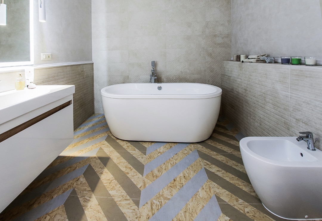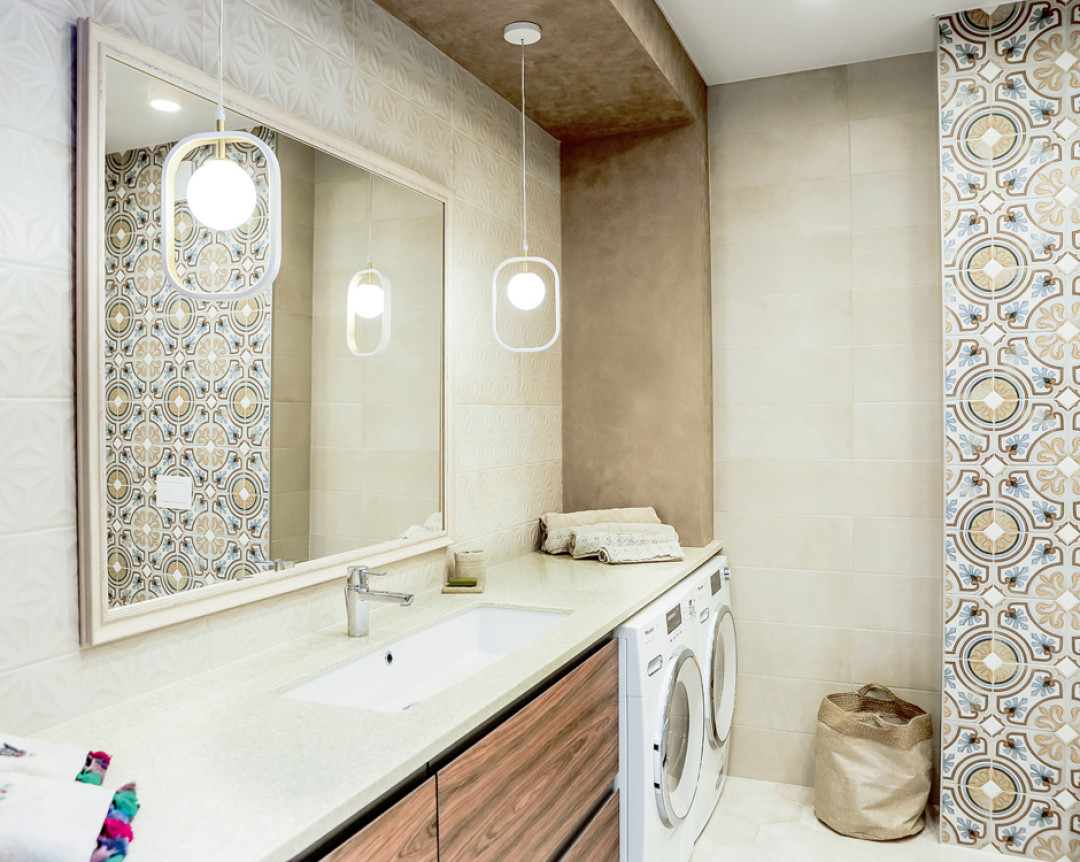 В санузлах установлены ванна, унитаз и биде оформление в ванных комнатах вторит общей концепции интерьера. Для отделки стен и пола была приобретена керамическая плитка, материал которой отличается прочностью и износостойкостью.
