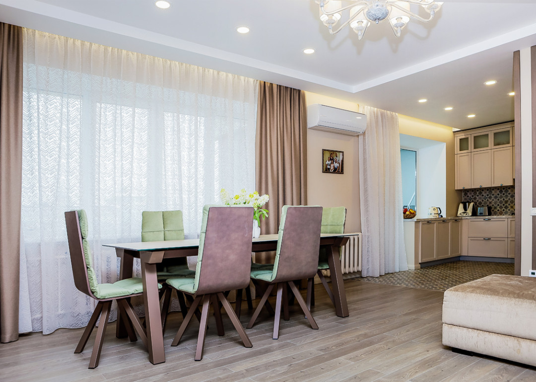 Гостиная – просторная и теплая, в мягких тонах, но с яркими деталями. Особую роль в интерьере играет текстиль. Окно рядом с обеденной группой украсили портьеры, которые по фактуре и цвету привязаны к обивочному материалу дивана, а тюль повторяет рисунок на стене и тем самым завершает ансамбль.