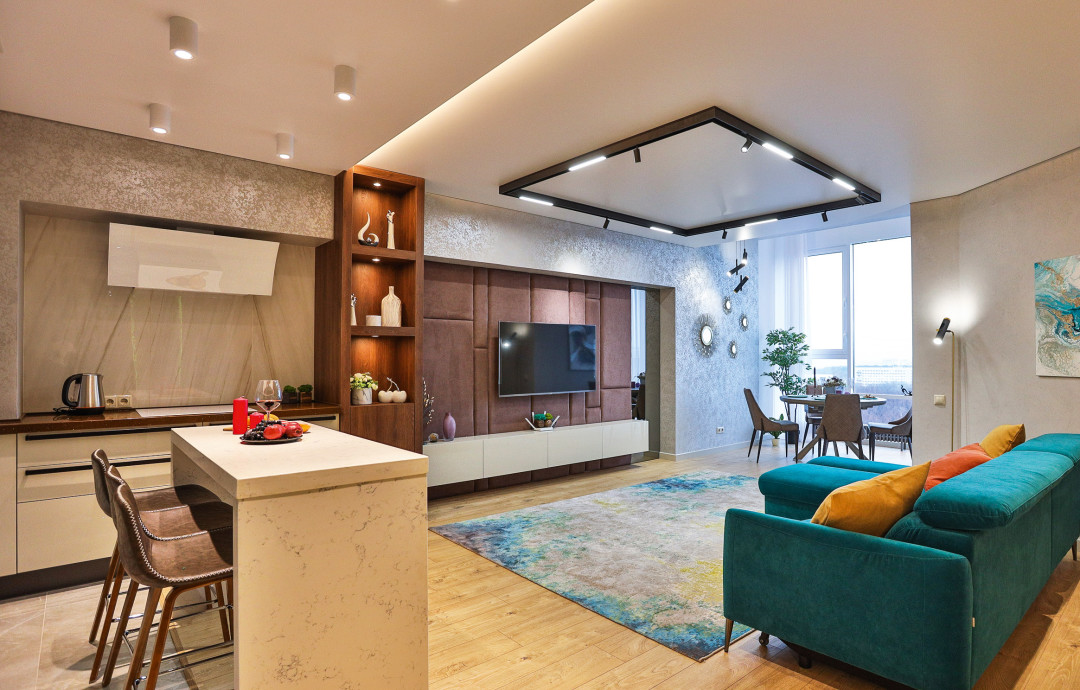 Владелица квартиры хотела сложный многогранный интерьер в современном стиле с яркими акцентами. Зонирование учитывало тот факт, что семья часто бывает в разъездах, но, если уж все дома, в гостях собираются сразу три поколения: и хозяева, и дети, и внуки. Поэтому дом должен был быть уютным, приветливым и удобным.