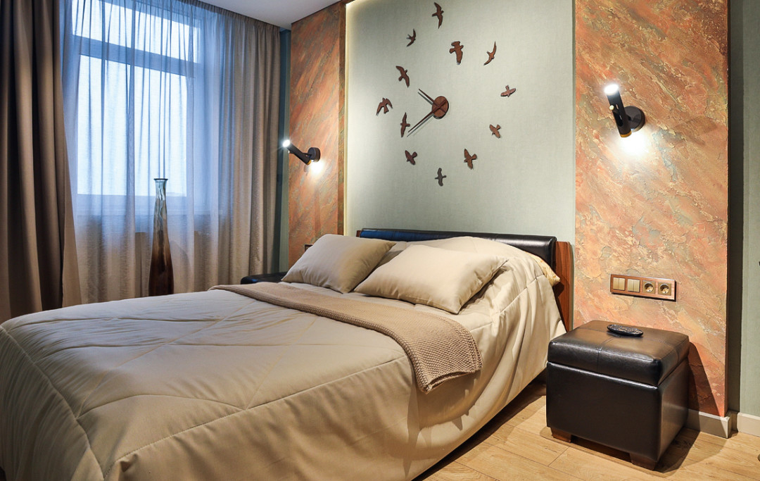 Вторая спальня больше мужская, поэтому здесь материалы использовали более строгие. Это декоративная штукатурка с имитацией камня, мягкий текстиль из натурального индийского хлопка и портьерные ткани. Легкая геометрия итальянской коллекции елочкой собрала интерьер в единое пространство.