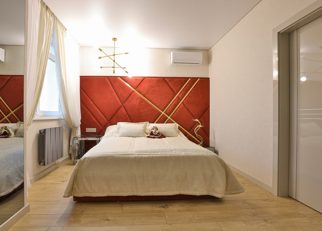 Чтобы уравновесить спальню и привнести легкость, мы использовали натуральные интерьерные ткани светло-бежевого оттенка с золотистым декором.