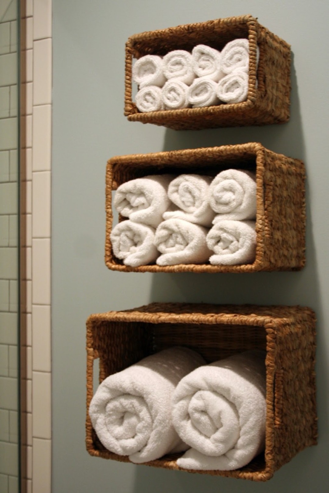Плетеные корзинки и небольшие коробки, прикрепленные к стене, – интересная альтернатива полкам. Они отлично смотрятся в гардеробной и в ванной комнате, где прекрасно подходят для хранения полотенец и косметических средств. Попробуйте складывать полотенца не столбиками, а рулончиками: это существенно сэкономит место, а доставать их станет гораздо легче.