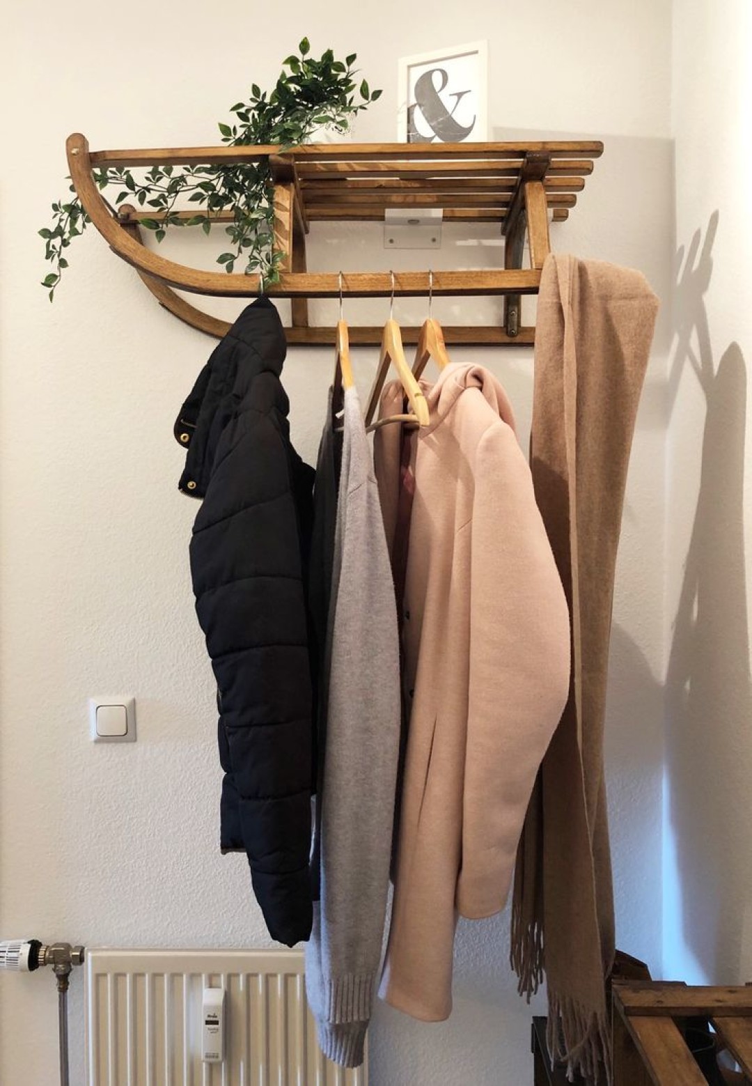 Неожиданно, но практично! Для хранения вещей или размещения декора подойдут даже стулья, прикрепленные к стене. Лучше всего — складные: когда они пусты, их можно компактно сложить. А идея для самых смелых декораторов – использовать санки.