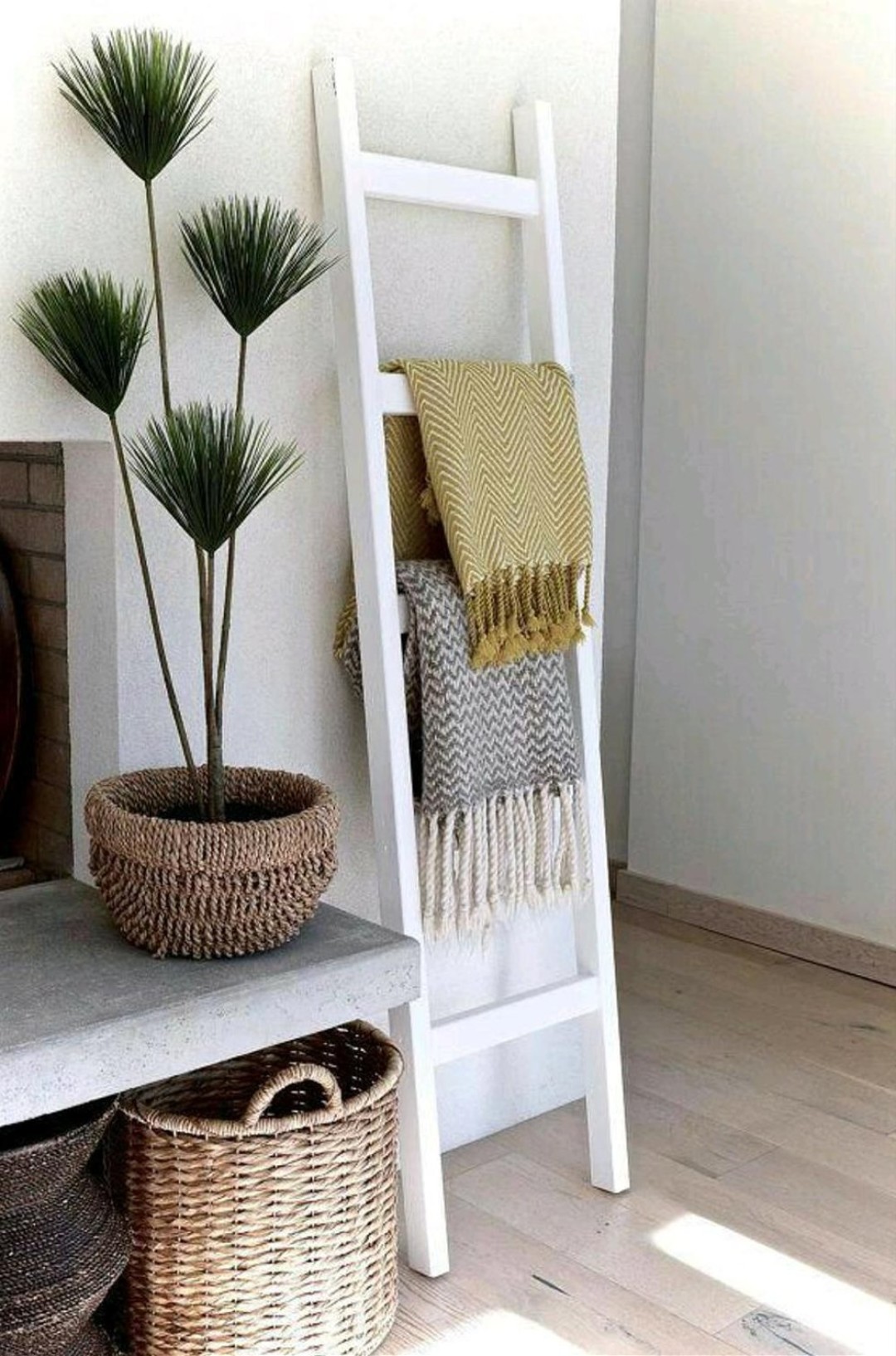 Приставная лестница – также самостоятельная и даже привлекательная единица интерьера, которая может служить вешалкой для полотенец, шарфов или пледов.