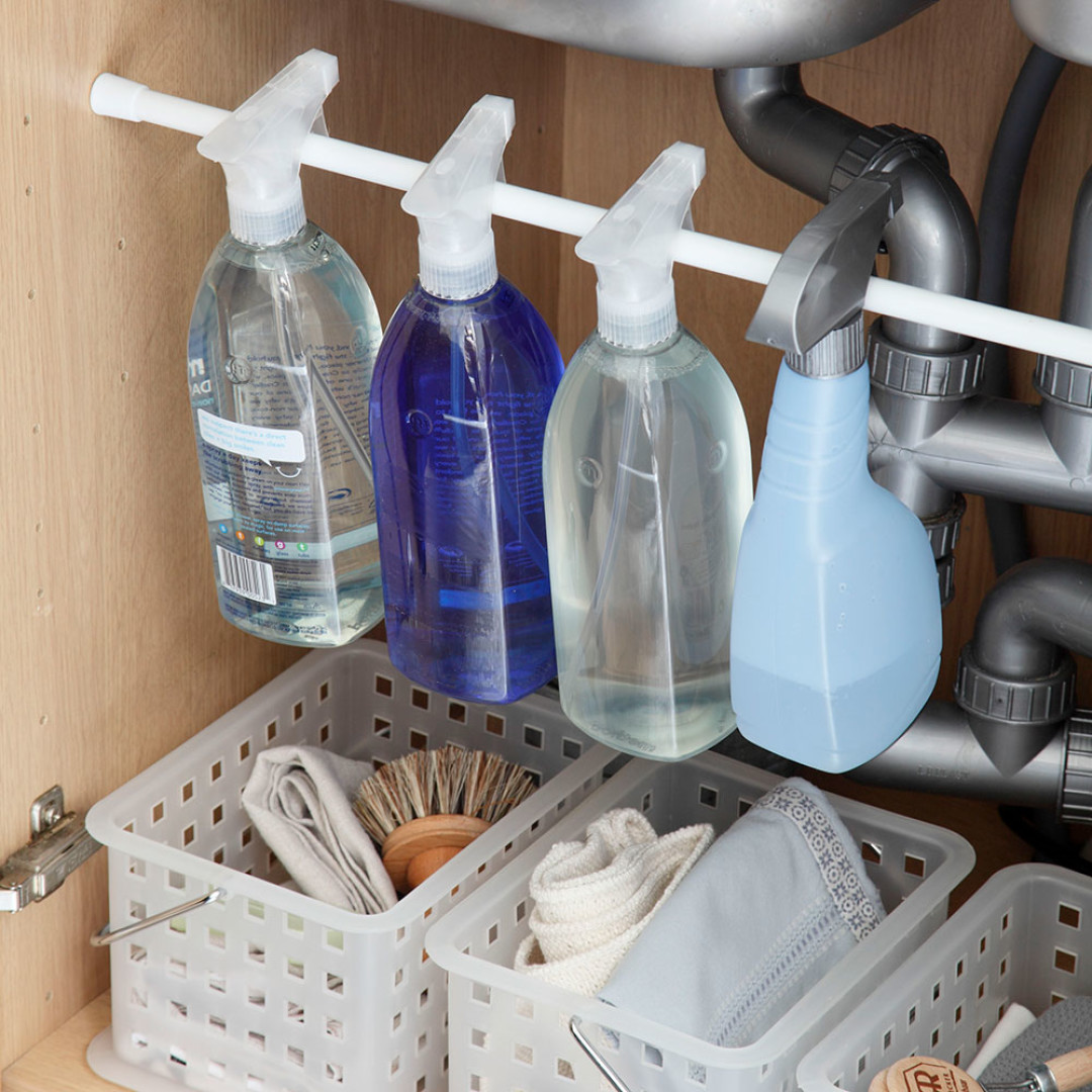 Чтобы хранить чистящие средства в шкафчике под мойкой было удобнее, используйте штангу. Вообще штанги – отличное решение, особенно для хранения одежды (в том числе в открытых системах).