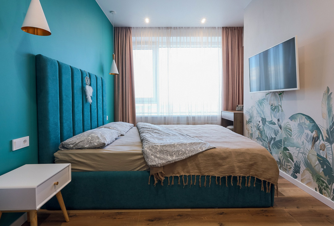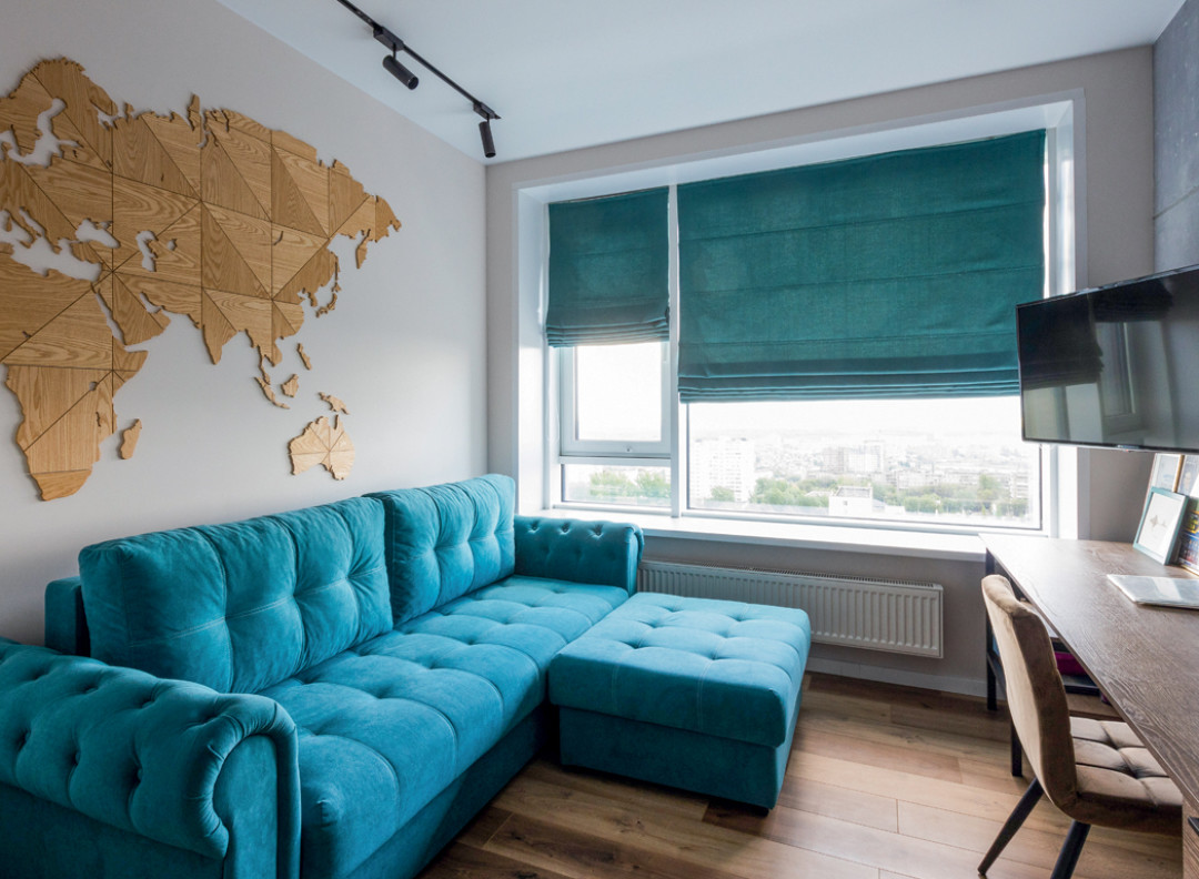 Вместе с владельцами квартиры основными цветами интерьера решено было выбрать оттенки природы: бирюзовый и молочно-белый – символизирующие море, а большую часть интерьерных деталей выполнили из дерева. Например, в ванной установили оригинальное зеркало из натуральных веток, а в кабинете повесили большую карту, на которой можно отмечать места путешествий.