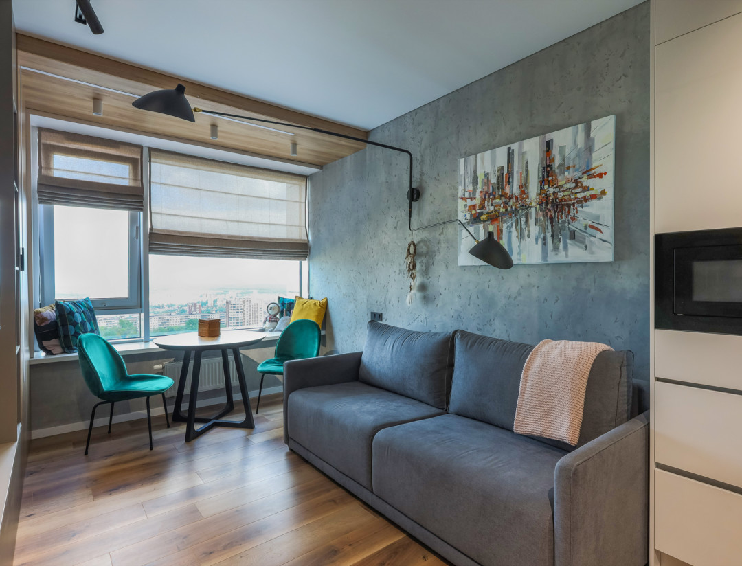 Дизайнеры студии декоративной штукатурки подобрали глубокие оттенки для ванной и более легкие для остальных комнат. Например, в гостиной декоративная штукатурка «под бетон» создает ощущение городской среды и активной повседневной жизни. А интерьер спальни сделала особенным, с необычной росписью, которая дает ощущения спокойствия и настраивает на хороший сон.