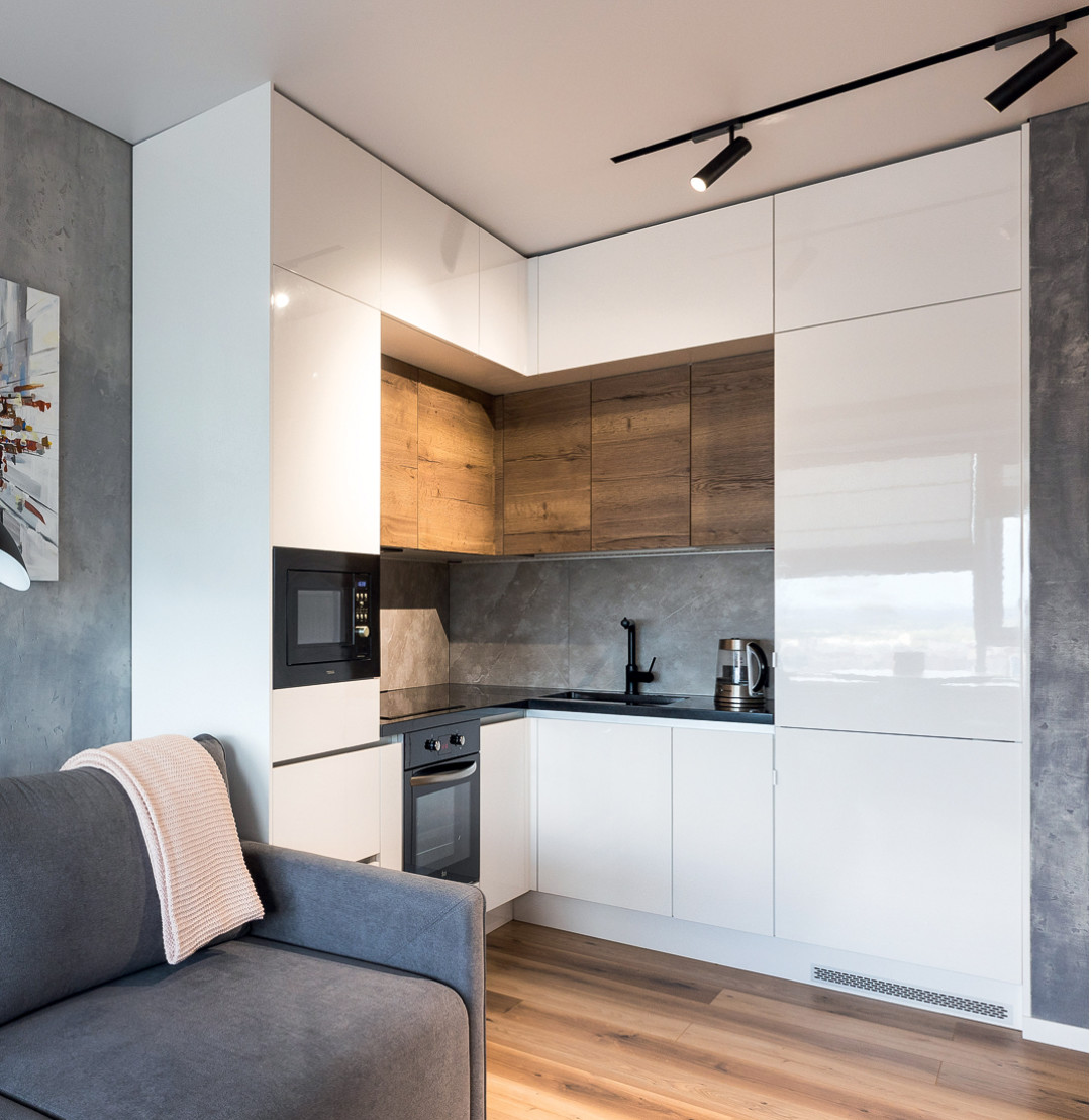 Просторный и «воздушный» интерьер невозможно создать без эргономичной организации пространства. Решить эту задачу помогли встроенные шкафы и компактный кухонный гарнитур.
