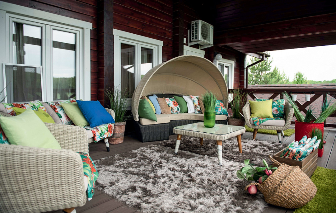 На просторной открытой террасе отдыхать всей семьей можно в любое время года. Большой стол, мангальная зона, подвесное кресло-кокон и качели создают приятную расслабленную атмосферу и так и манят гостей в свой маленький уютный рай.