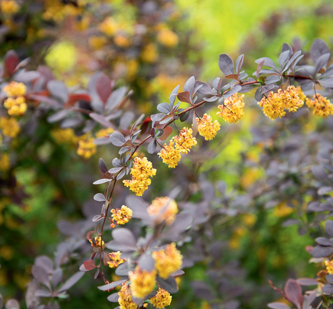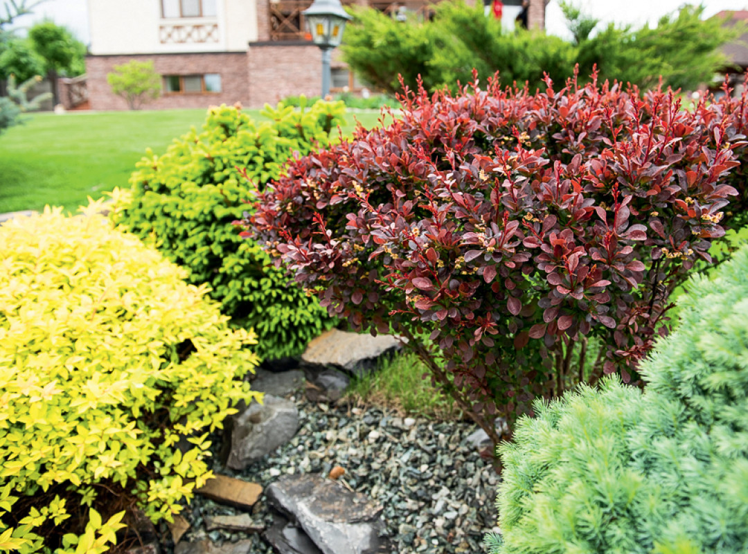 У кустарников в этом саду настоящая монополия: ароматные барбарисы, эффектный дерен, нежная жимолость, снежноягодник и лапчатки самых разнообразных сортов играют роль живой изгороди и помогают эффектно зонировать территорию сада.