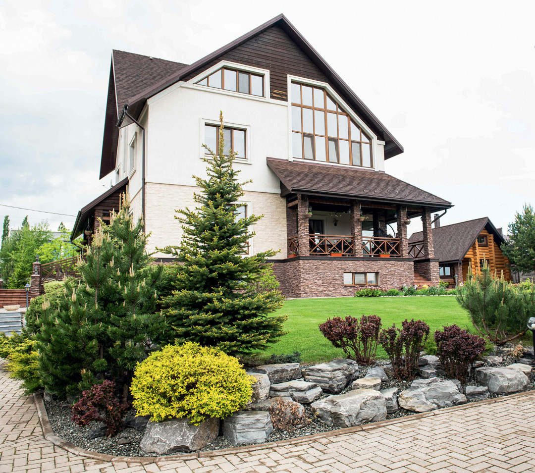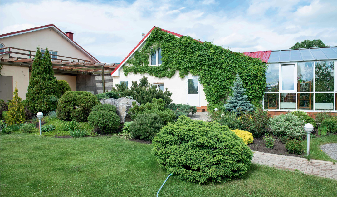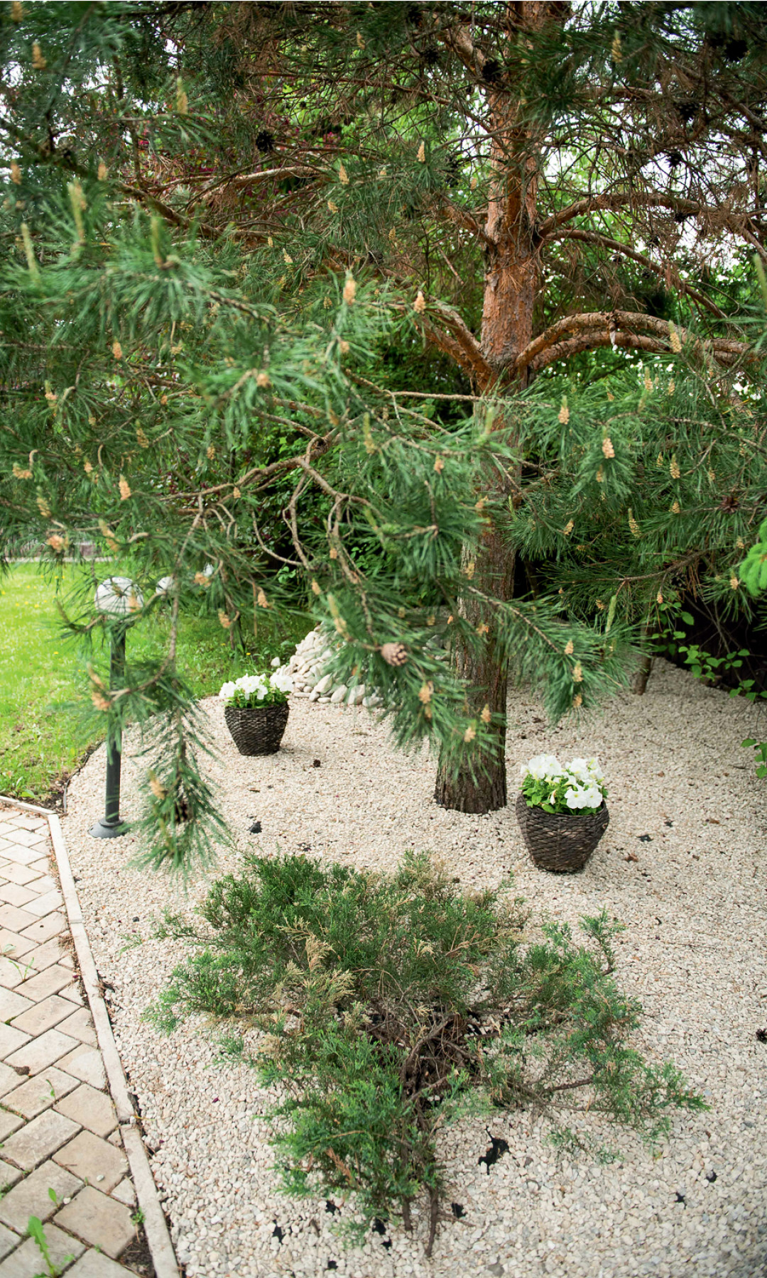 В первую очередь мы отправились в гости к Юлии Романчевой, зная, что ее страсть – садоводство. Зеленые зоны в саду Юлии соседствуют с многочисленными местами для отдыха. Можно присесть в тени под соснами, устроиться рядом с летней кухней или расположиться за большим столом. Здесь семья любит завтракать и обедать в летний зной. В саду правят бал елки и горные сосны, красные и зеленые туи, можжевельники и барбарисы.