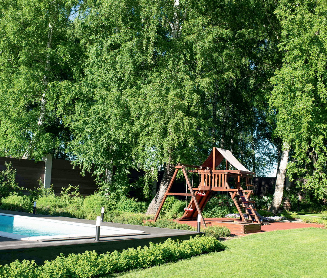 Для детей в саду обустроили игровую площадку с качелями, газоном и бассейном. Есть и небольшой огородик с ягодами: малиной, смородиной, крыжовником, из которых делаем морсы, есть и нежные молодые яблони. Последние три года живем в доме постоянно.