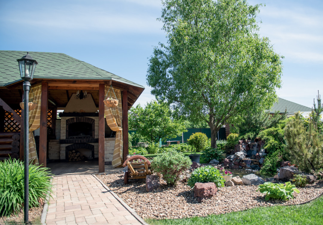 Прогулявшись по саду и наглядевшись на цветы, попадаем в зону отдыха. Мангальная зона с беседкой обустроены так, чтобы места для отдыха хватило даже большой компании. Наслаждаясь поджаренными на огне баклажанами и ароматным шашлыком, можно любоваться мини-прудиком с каскадным водопадом. А впереди нас ждет еще банька с бассейном – вот оно, раздолье загородной жизни!