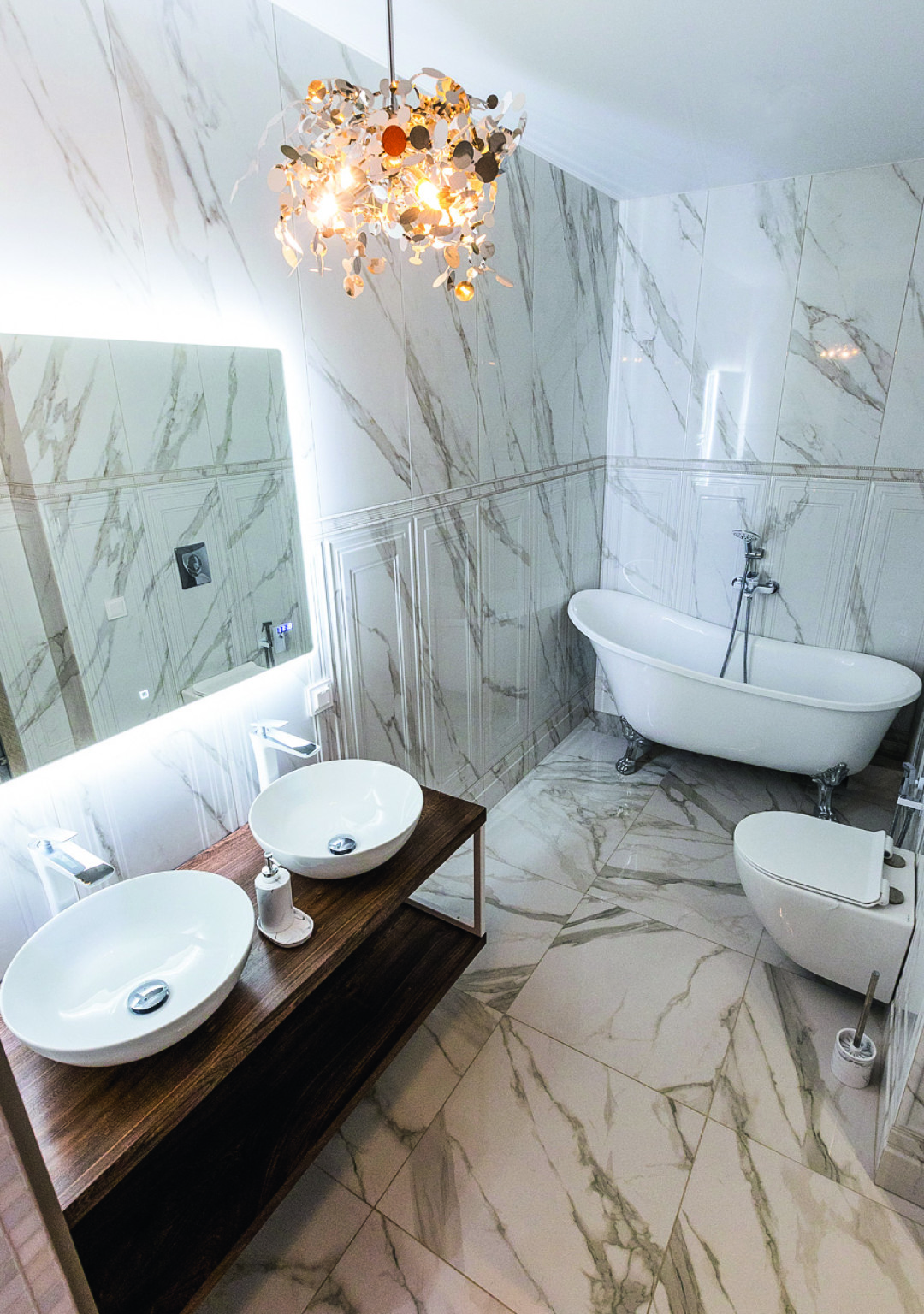Интерьер ванной комнаты, выполненный в классическом стиле, перекликается с общей концепцией. Здесь много свободного пространства, в оформлении использованы лаконичные цвета. Для того, чтобы придать этому помещению элегантность, дизайнер выбрала в качестве отделки роскошную керамическую плитку Kerama Marazzi из серии «Прадо».