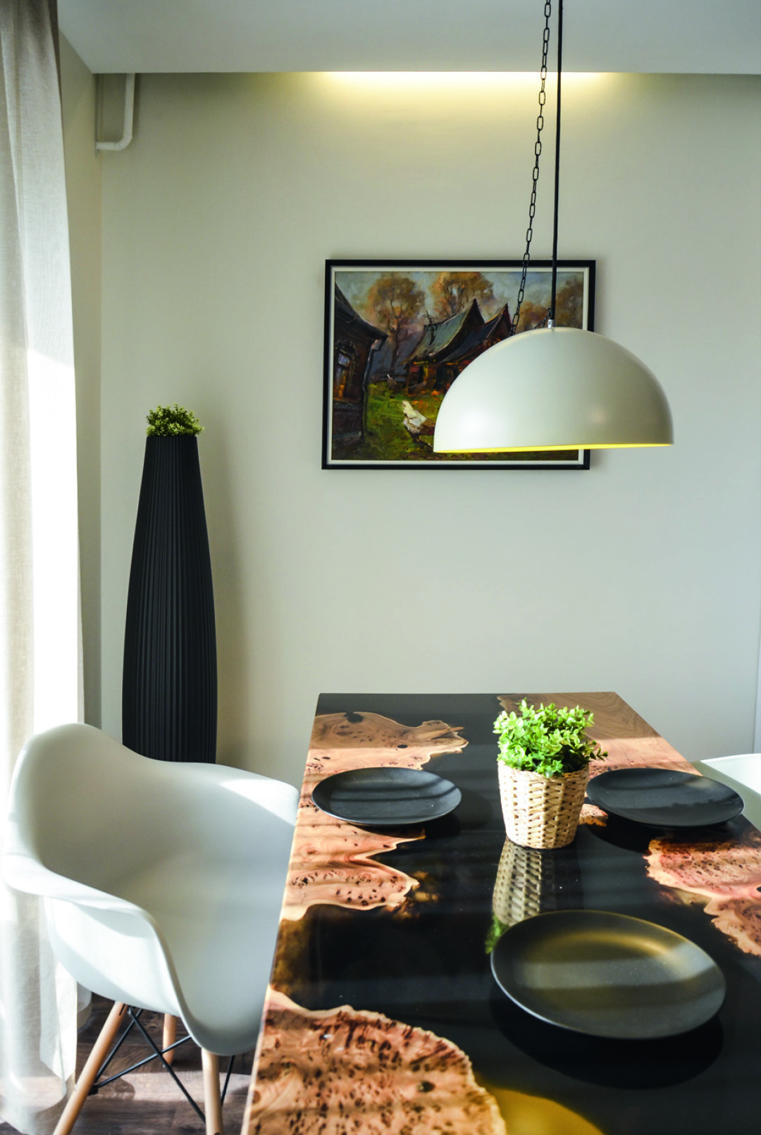 Вечерами перед камином можно расслабиться в мягком кресле горчичного цвета польского производства. В такие моменты таунхаус напоминает загородный дом. Но совершенно другая атмосфера царит по утрам в отдельной кухонной зоне-острове для завтраков. Создавать разные настроения в кухне-гостиной легко благодаря продуманному освещению и оригинальным аксессуарам: таким, как, например, изящная итальянская ваза.
