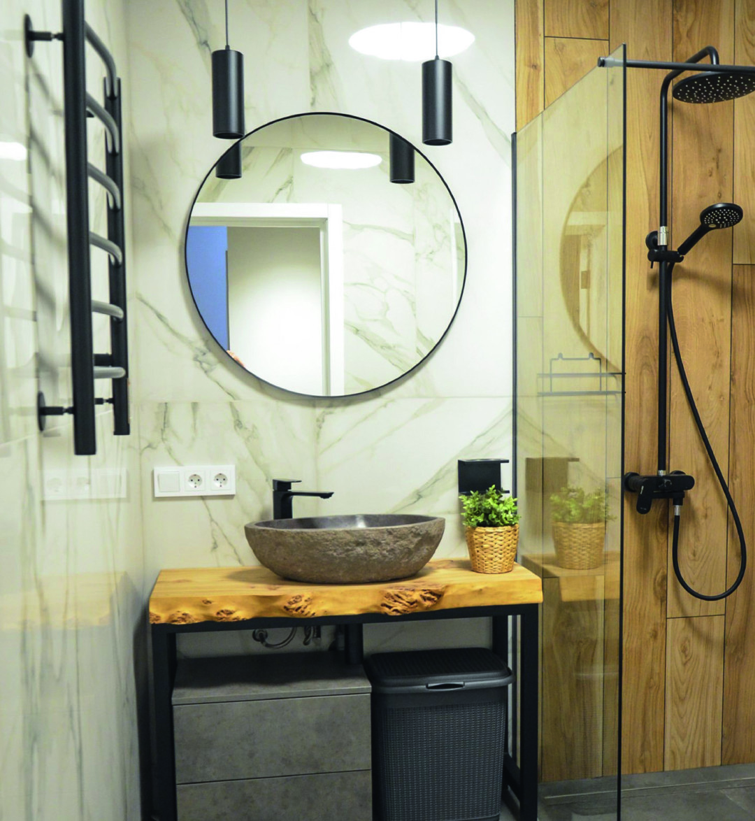 Обстановка душевой комнаты продолжает идею баланса между традиционным и современным. Эксклюзивную сантехнику от европейских брендов нам предоставили и установили профессионалы. Элементы стиля лофт вносят смесители, полотенцесушители, душевая перегородка, ручки, полочки и другие аксессуары в элегантных черных цветах. Чтобы интерьер не выглядел холодным, выбрали керамогранит с имитацией текстуры натурального дерева. Так душевая стала более уютной, манящей и располагающей к отдыху и расслаблению. А для кухни-гостиной консультанты смогли найти идеальный керамогранит под мрамор с характерным рисунком.