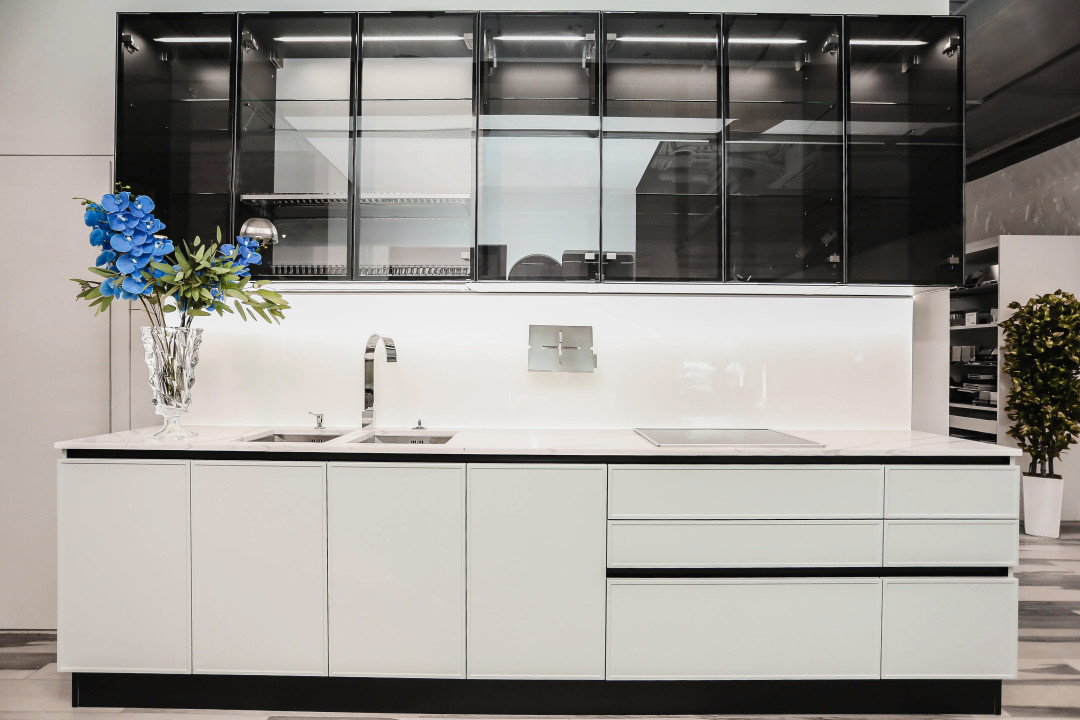 Ушли в прошлое темные, глянцевые кухни, а также кухни в стиле лофт. Актуальны белые фасады в сочетании с чистыми яркими цветами – например, красный или желтый. Приветствуется также шпон натурального дерева со сложными оттенками: оливковым, терракотовым, латте. В тренде оформление фасадов стеклом, керамикой, эмалью и смелое сочетание разных материалов. Долгие годы в смесителях, цоколе, мойке, ручках и различных вставках лидировал хром. Сейчас на смену ему пришли лимонное и розовое золото, медь и латунь. Все чаще мы видим кухни без верхних шкафов. Нередко фасады целиком скрывают рабочую зону: пеналы, раковину, вытяжки, варочные поверхности. Техническая часть не должна привлекать внимание, уступая ведущую партию оригинальным панно с многоуровневой подсветкой, необычным светильникам и другим дизайнерским решениям.