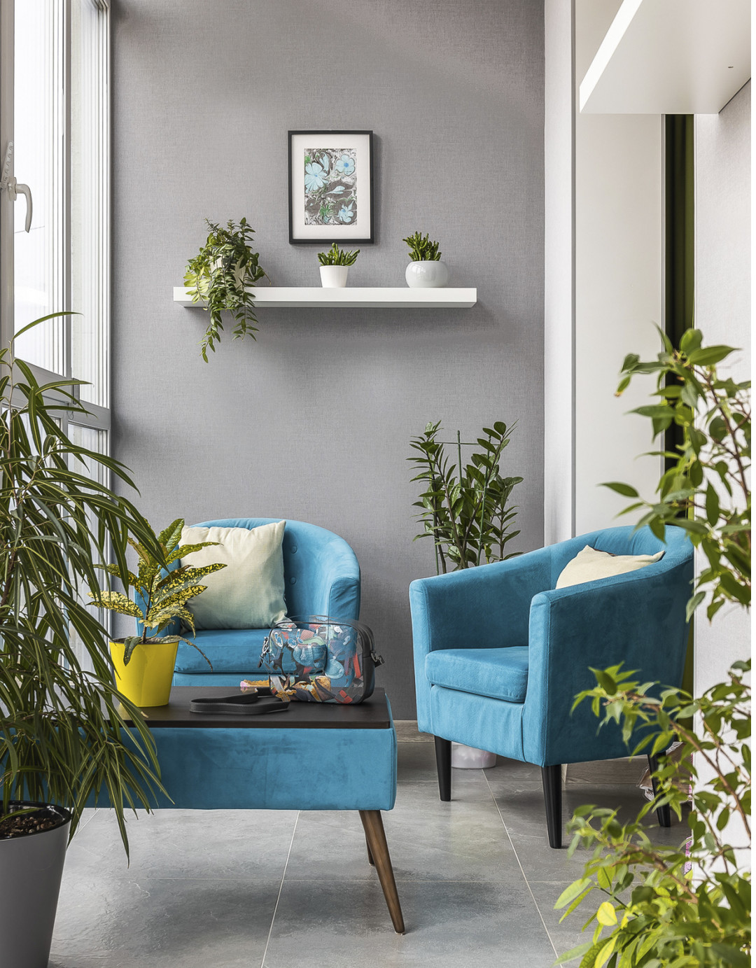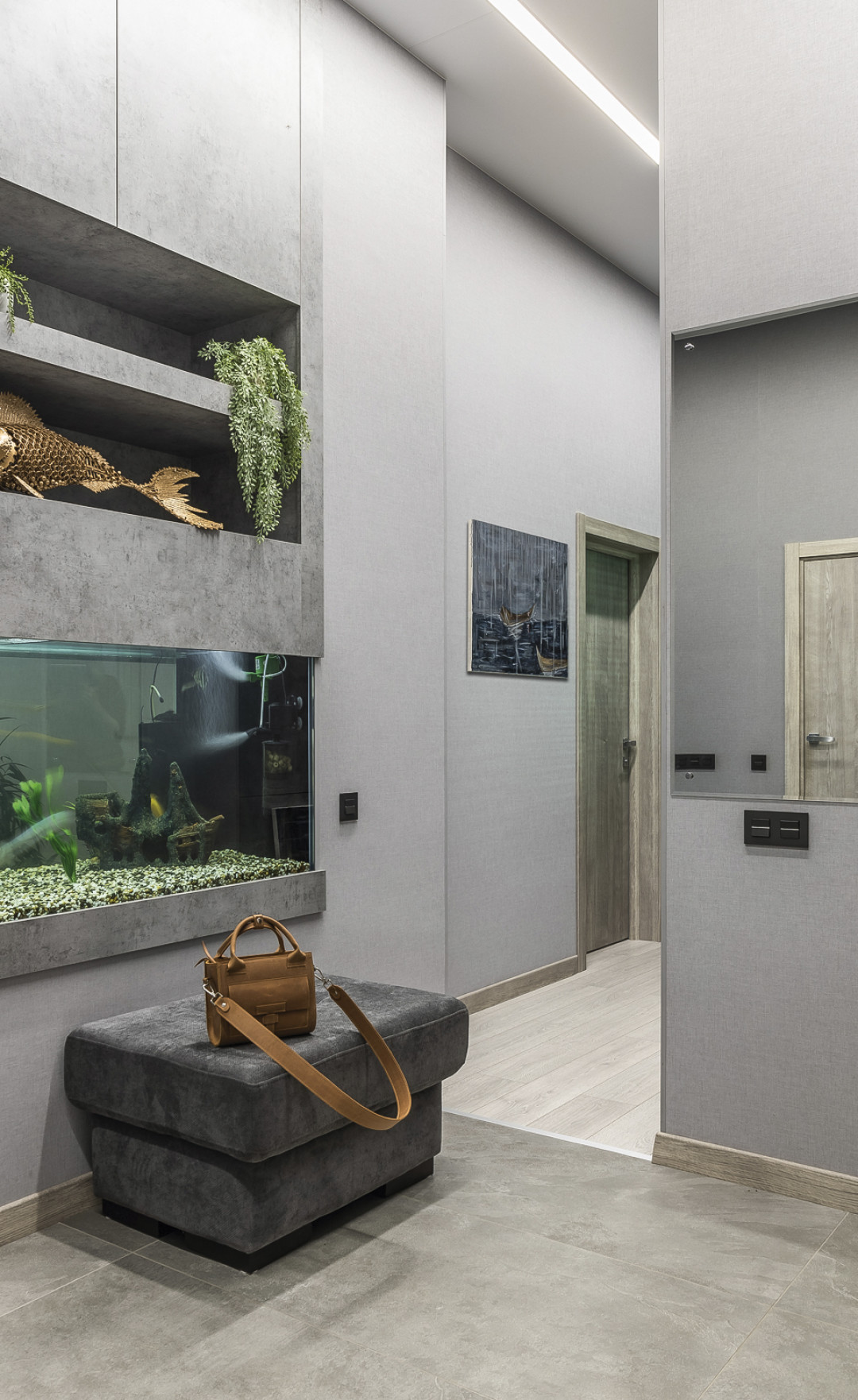Аквариум стал фишкой интерьера. Он выполняет сразу две функции: отделяет прихожую от гостиной и создает вау-эффект. Яркие рыбы за стеклом – первое, что видит человек, когда заходит в квартиру.