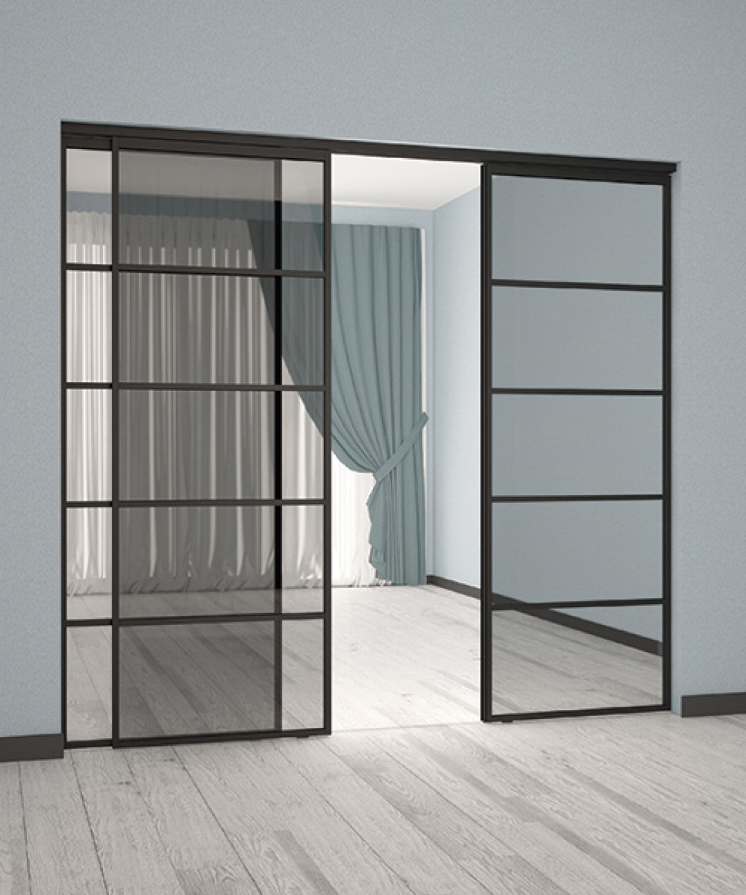 Конструкция открывания раздвижного механизма, позволяющая использовать систему с бюджетными каркасными полотнами стандартных размеров. При установке такой двери не нужно зарезаться в полотно: раздвижная система позволяет полностью скрыть вид скользящей дорожки, как с открытой, так и с закрытой дверью. Амортизаторы обеспечивают мягкое торможение при открытии и закрытии. Треки крепятся в верхний и нижний края полотна.