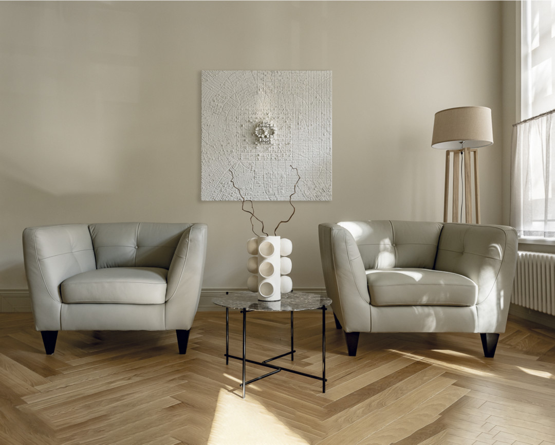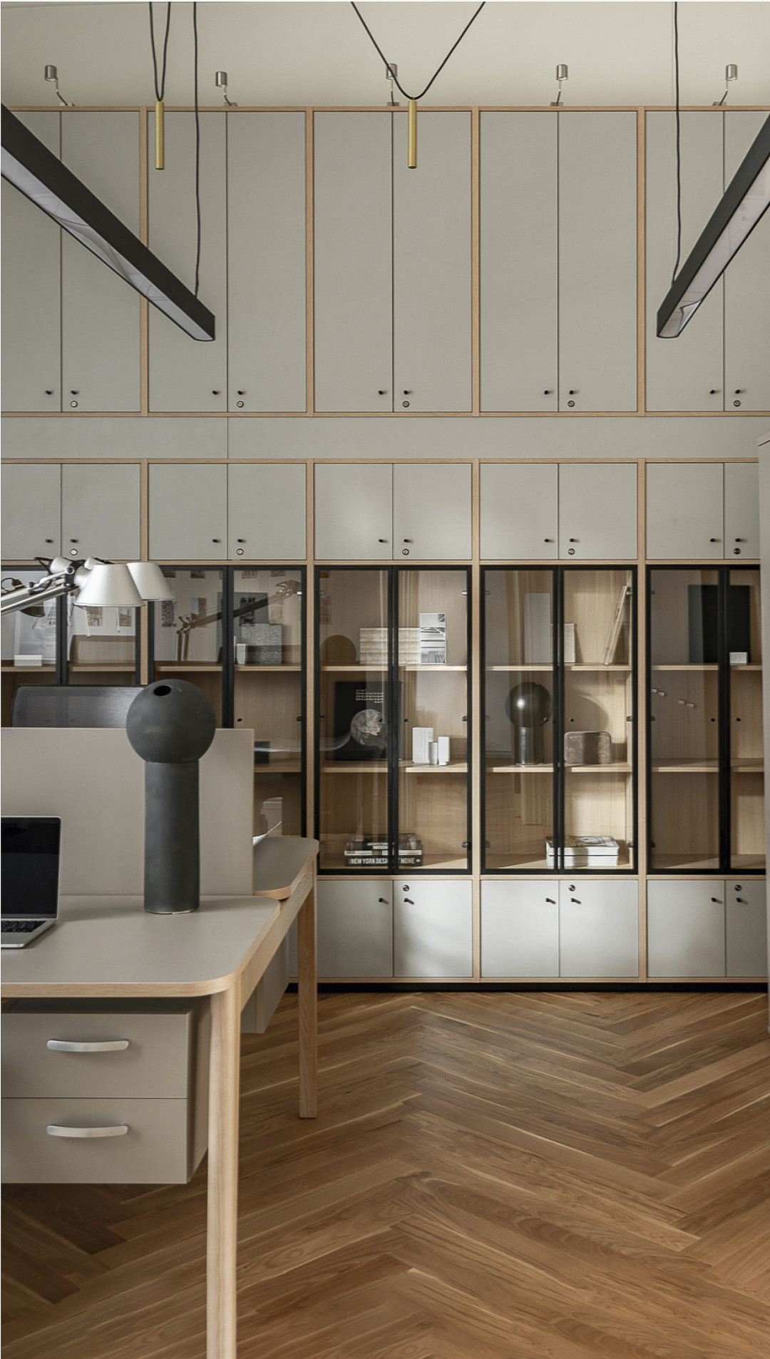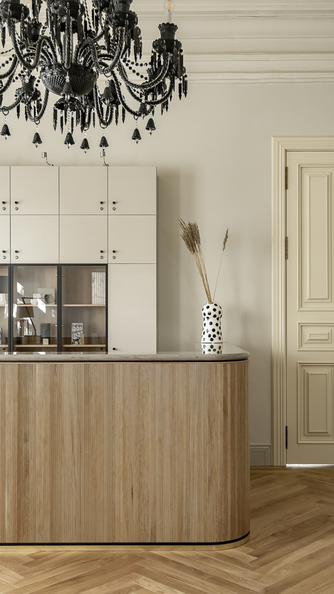 Пространство особняка поделили на две части: для внутренней работы специалистов и для менеджеров, где также разместили конференц-зал. Два блока объединены общей приемной. На втором этаже оборудовали кабинет генерального директора. Монохромный интерьер в кремовых, светло-коричневых и серых тонах сделали по-домашнему уютным за счет наполнения различными фактурами и материалами: натуральным деревом, керамикой, камнем и кожей, текстилем. Оживить застывшее во времени здание помог и декор: вазы, картины и серия фотографий.