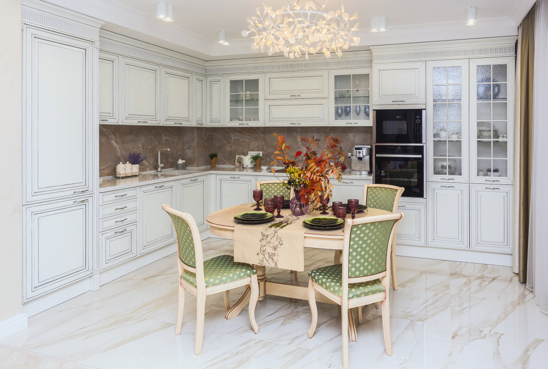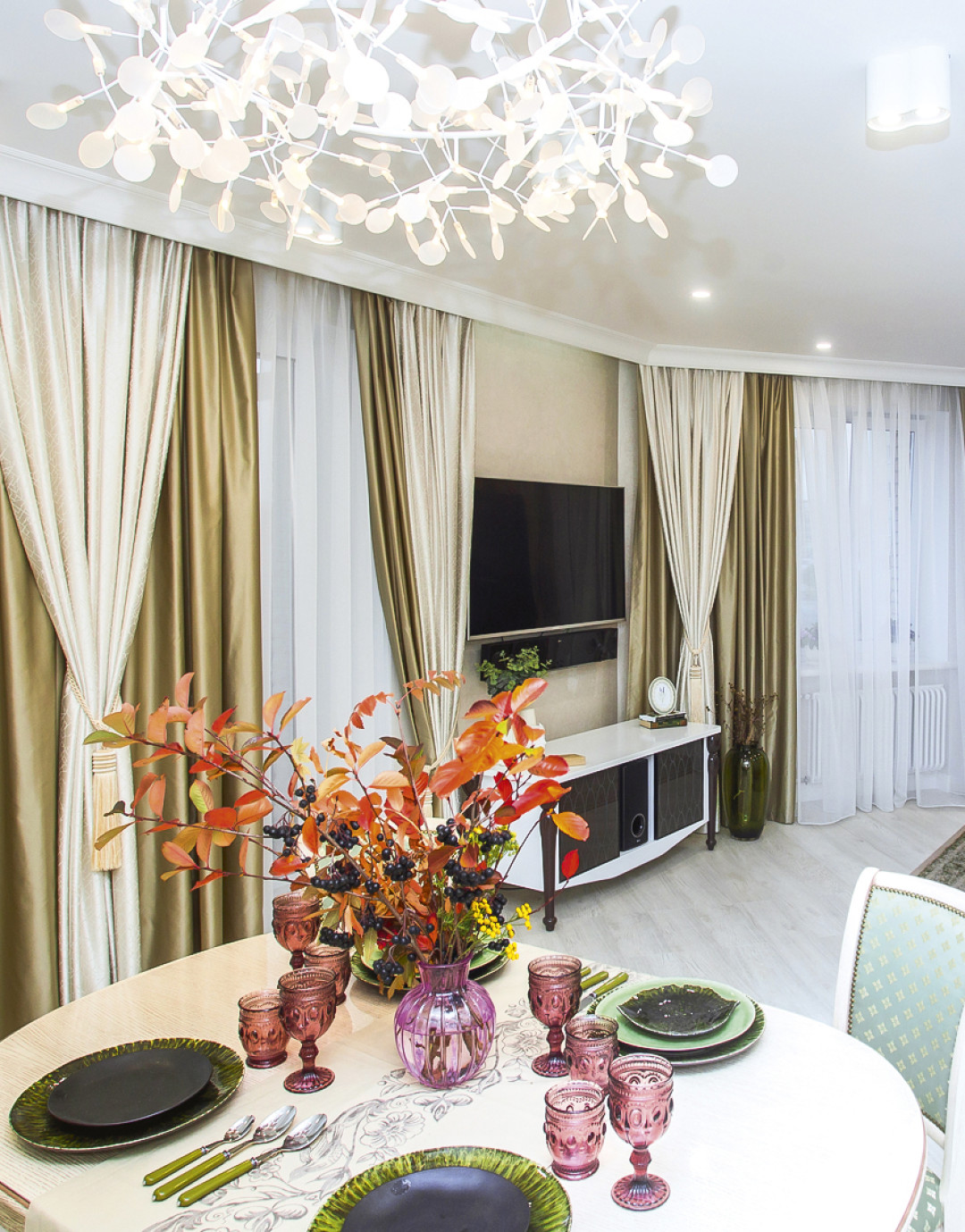 Некоторые предметы мебели из уже существующего интерьера решили сохранить: диван бежевого цвета, витрину и обеденный стол. Свежее неоклассическое настроение в квартиру привнесли тумбы, комоды и консоли.