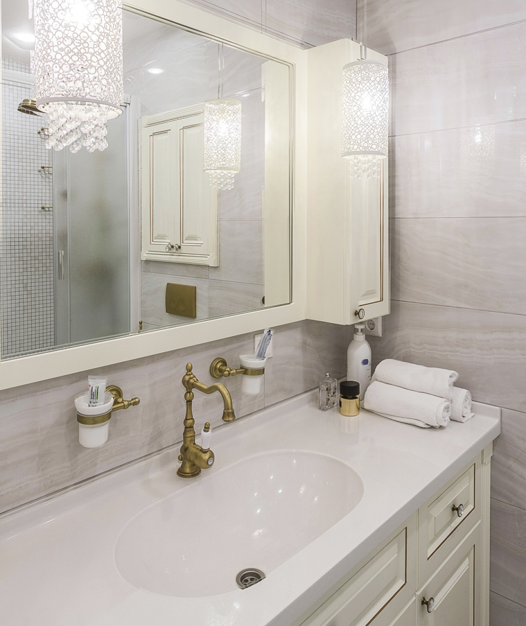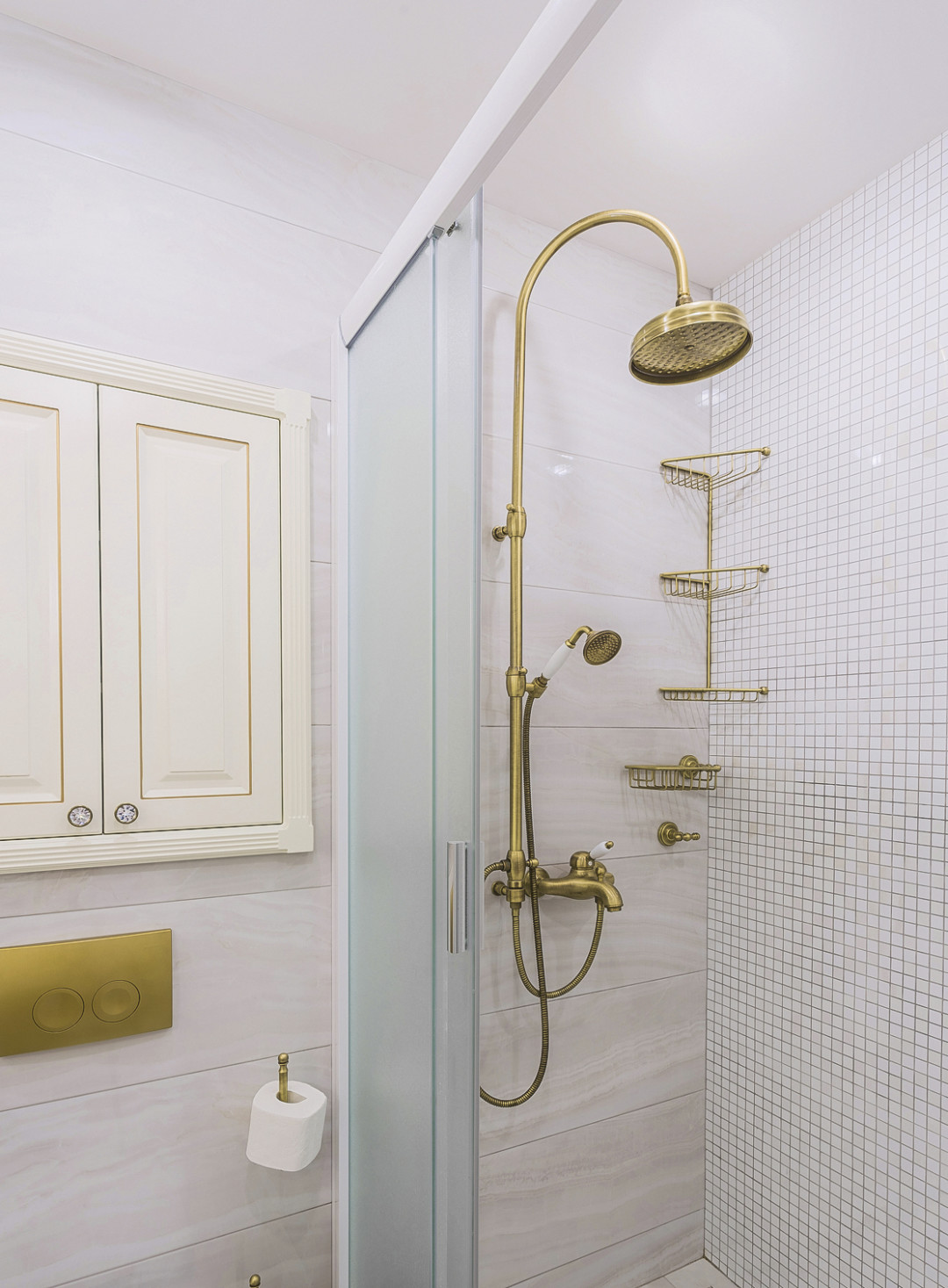 Для облицовки стен в ванной выбрали итальянскую плитку. Сдержанный стиль ванной комнате задает лаконичная сантехника итальянского производителя и французского бренда. Утонченные смесители и аксессуары подобрали в актуальном оттенке «лимонное золото». Полотенцесушители установили от демократичного бренда, а душевую дверь – от чешского изготовителя.