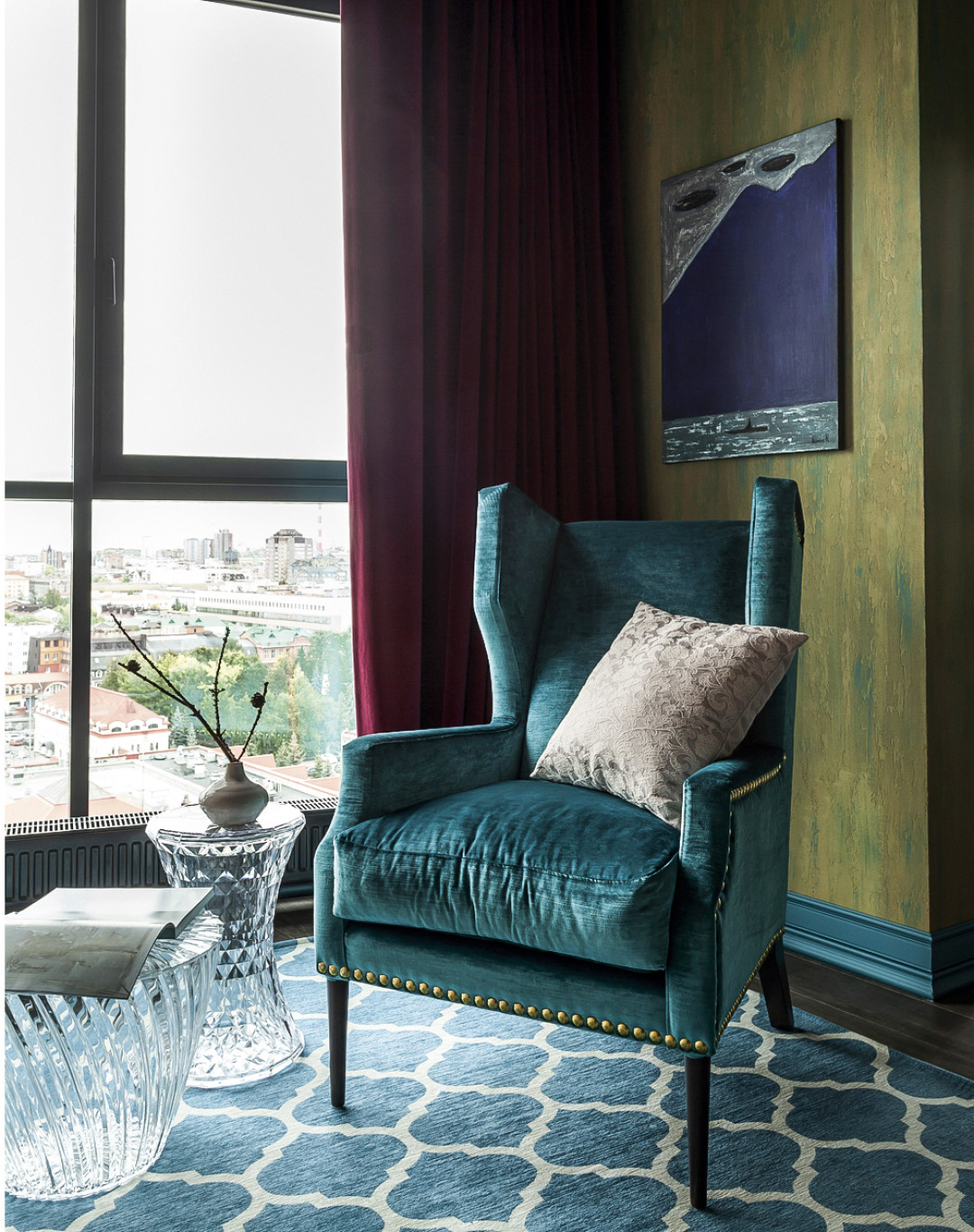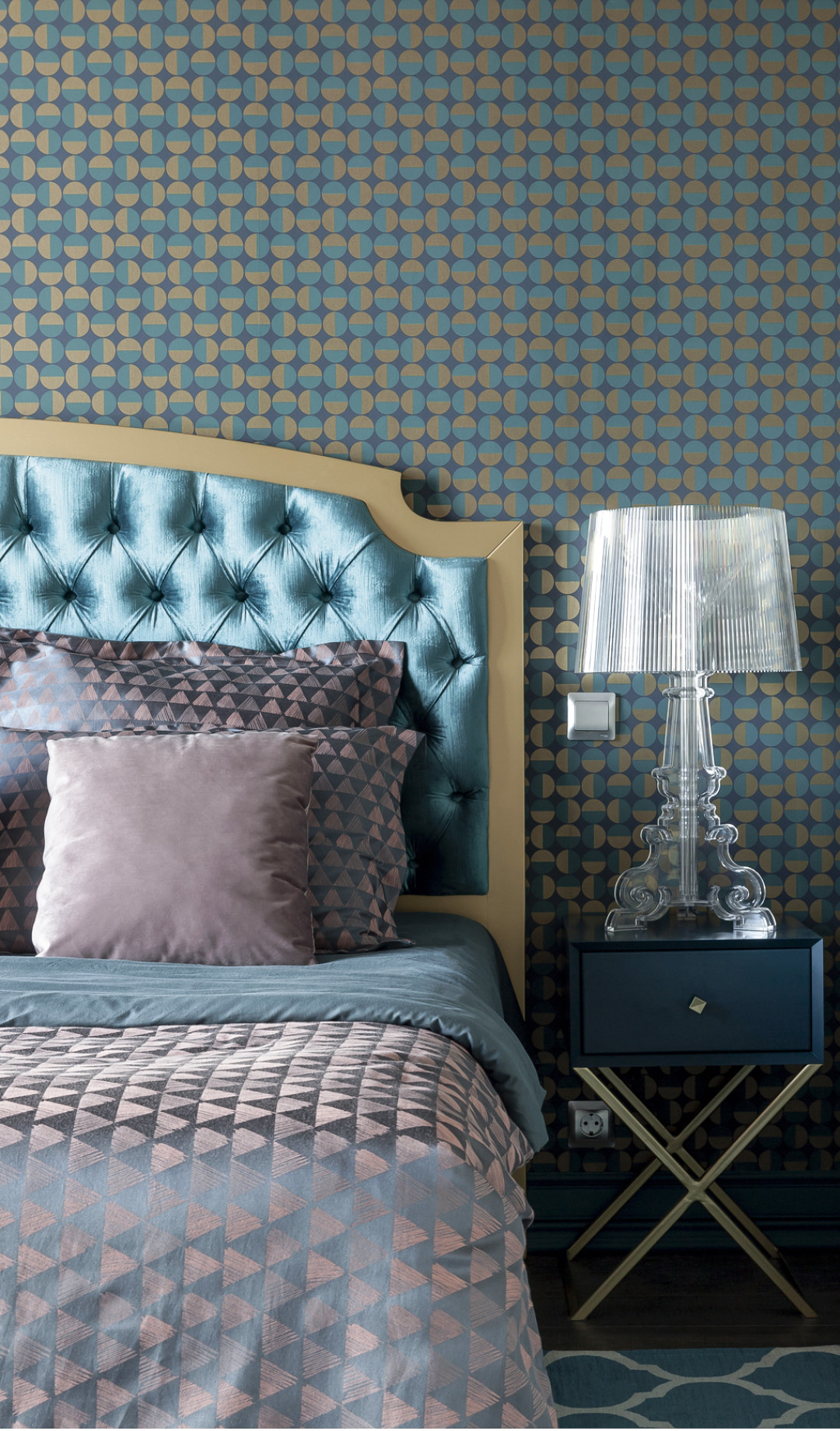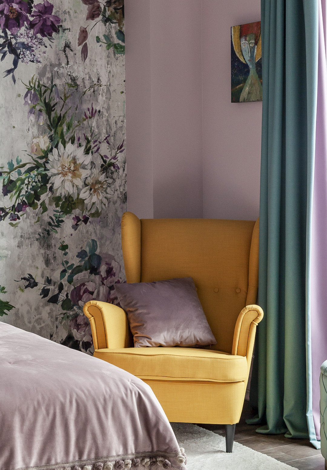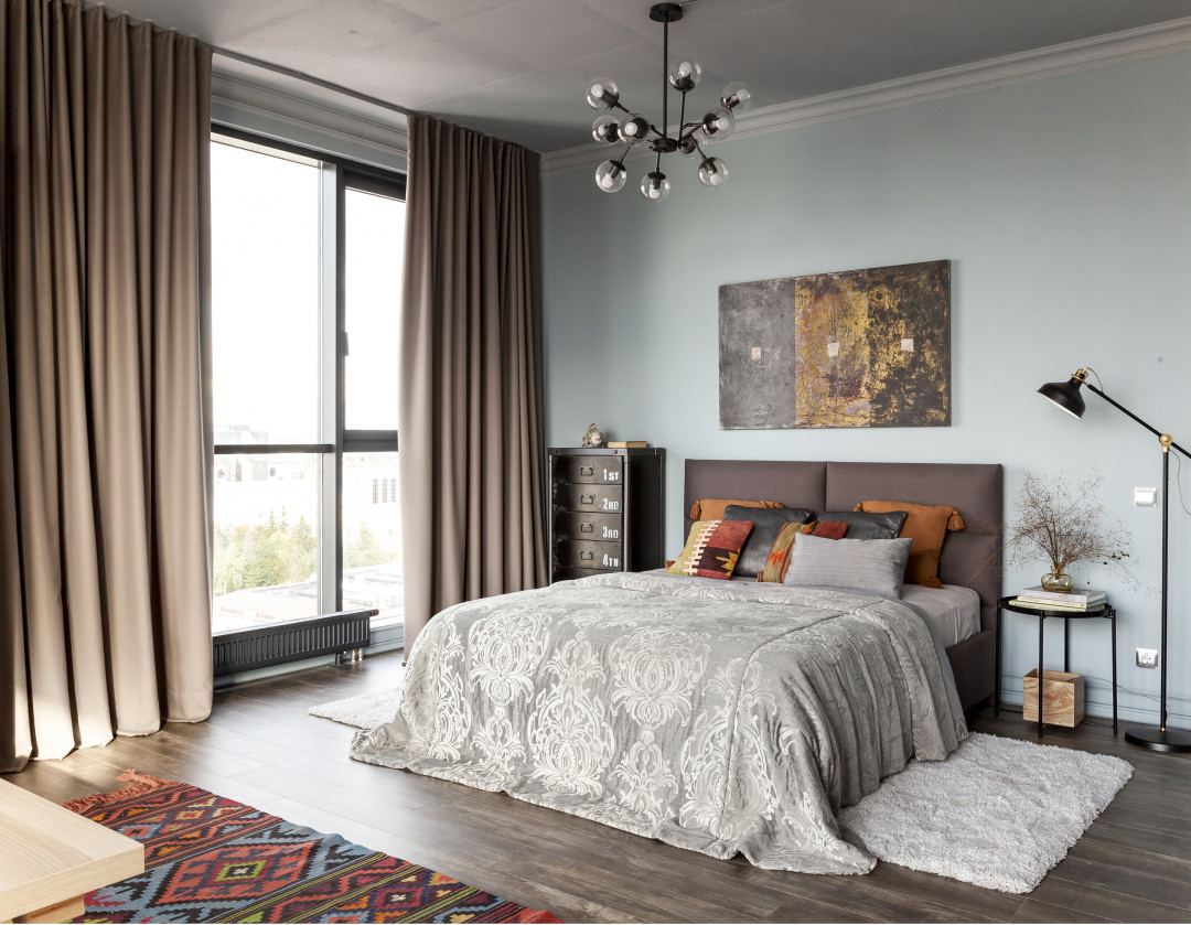 Обои в спальне родителей выбрали от Borastapeter коллекции Scandinavian Design II. Для спальни родителей мы смешали лофт и рококо. Роскошная кровать с бархатным изголовьем, кресло в бирюзовой бархатной обивке, бордовые бархатные шторы с бирюзовой подкладкой, роскошное покрывало и те же необработанные кирпичные стены, и бетон потолков – отсыл к лофту.