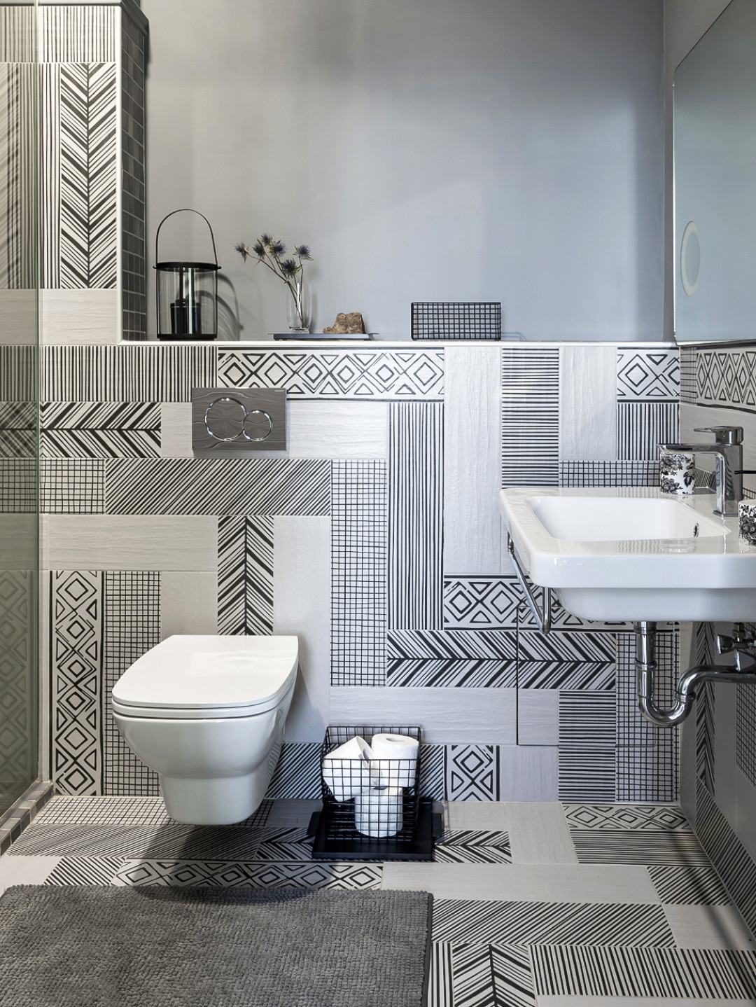 Одна из стен в столовой декорирована плиткой SantAgostino, эта же плитка переходит на стену в холле и на пол в прихожей. Ее геометричный рисунок на стене столовой создает интересный контраст текстилю от английского бренда с глубокой историей Morris & Co. Так, сочетая на первый взгляд несовместимые элементы, мы получаем очень необычный интерьер.