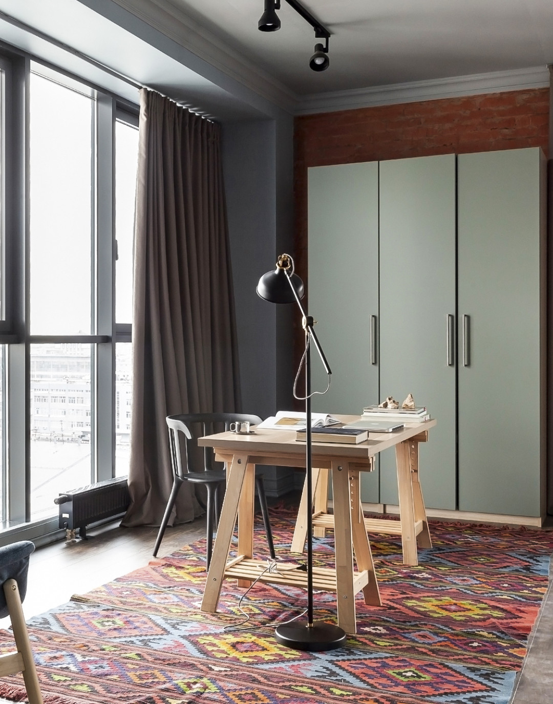 Комната старшего сына – лофт, смешанный со Скандинавией и элементами восточного колорита. Чтобы внести яркий национальный акцент в достаточно минималистичный интерьер, добавили ковер-килим: это Узбекистан, начало XX века. По цвету он вписался идеально. Как и во всех остальных помещениях, потолки мы оставили необработанными. Кроме того, не стали трогать кирпичную кладку: просто почистили ее и покрыли лаком. Получилось эффектно.