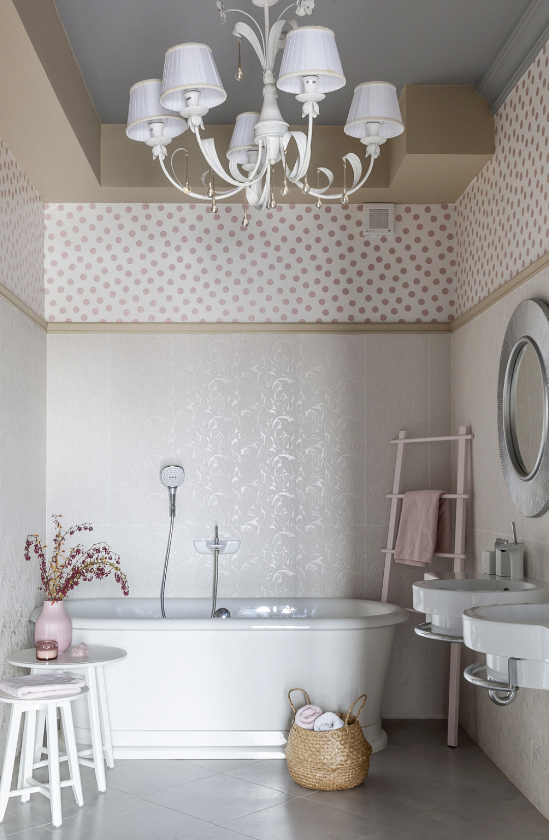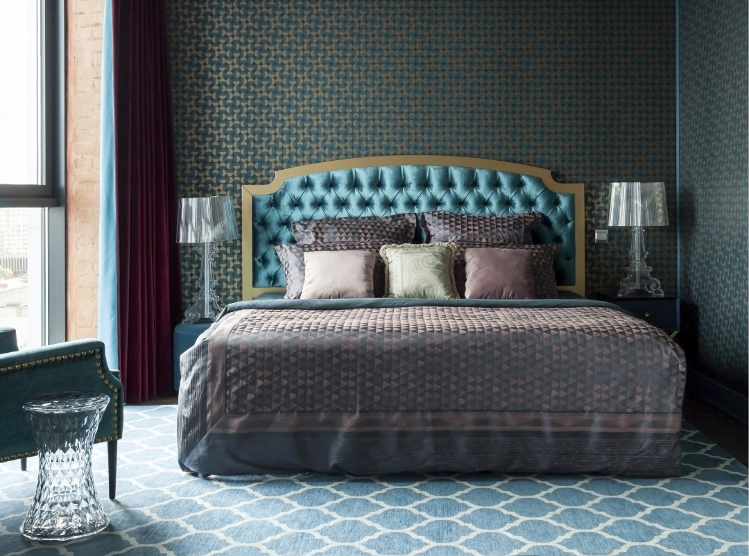 Интерьер завершили роскошные кровати, отсылающие к рококо, и классические потолочные светильники. Цветовую гамму поддержали текстильным оформлением.