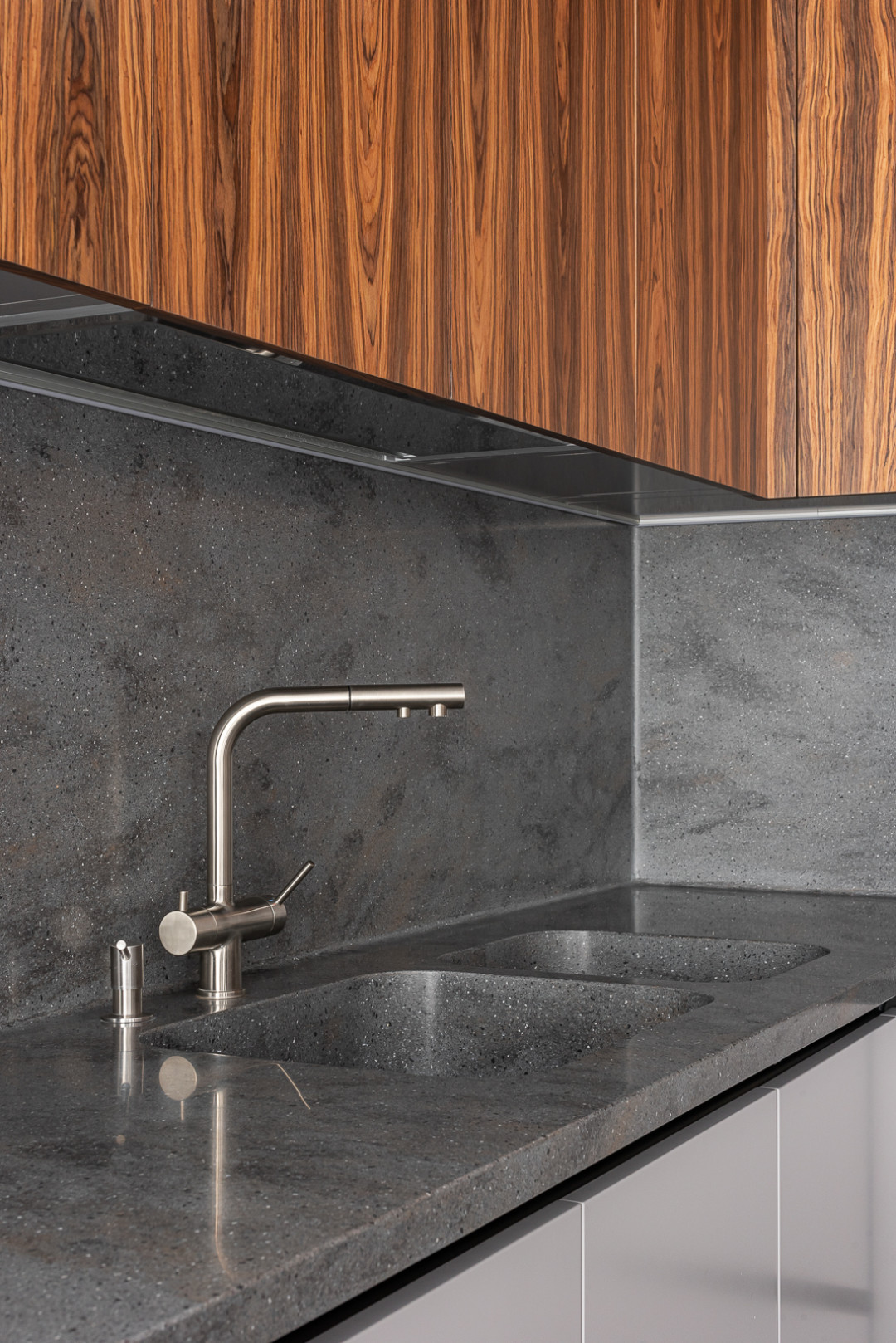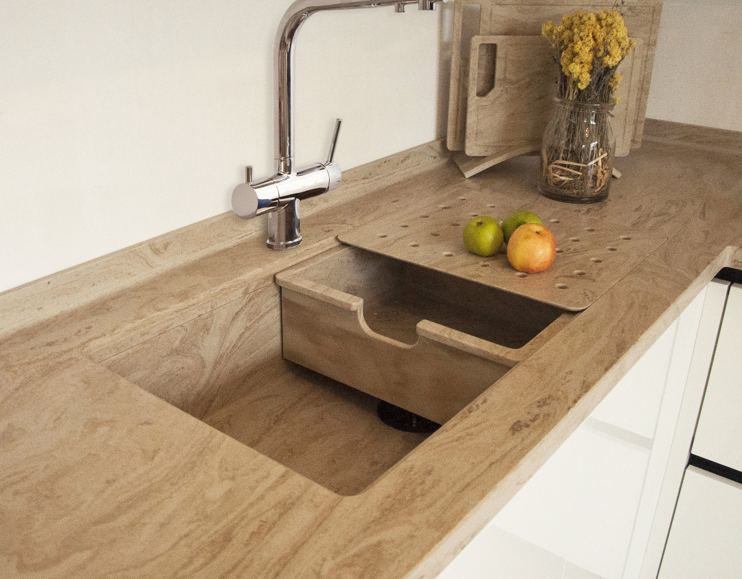 Искусственный камень позволяет сохранять не только целостность поверхности, но и направление рисунка, каким бы сложным он ни был. Создается впечатление, что изделия высечены из целого куска. Особенно эффектно выглядят угловые столешницы и подоконники.