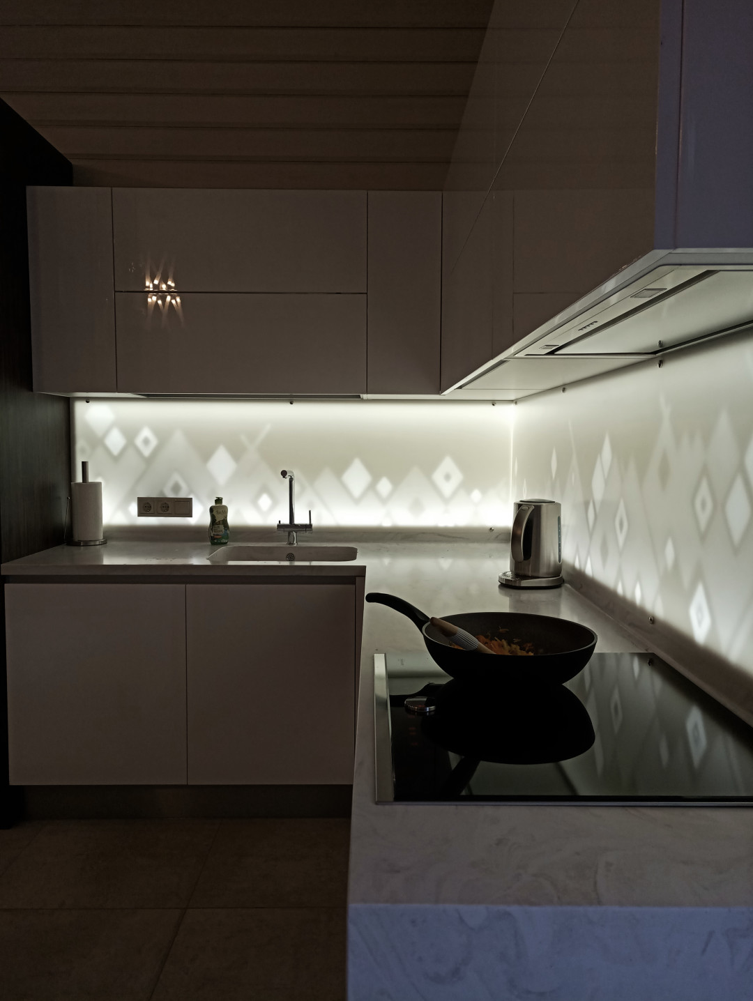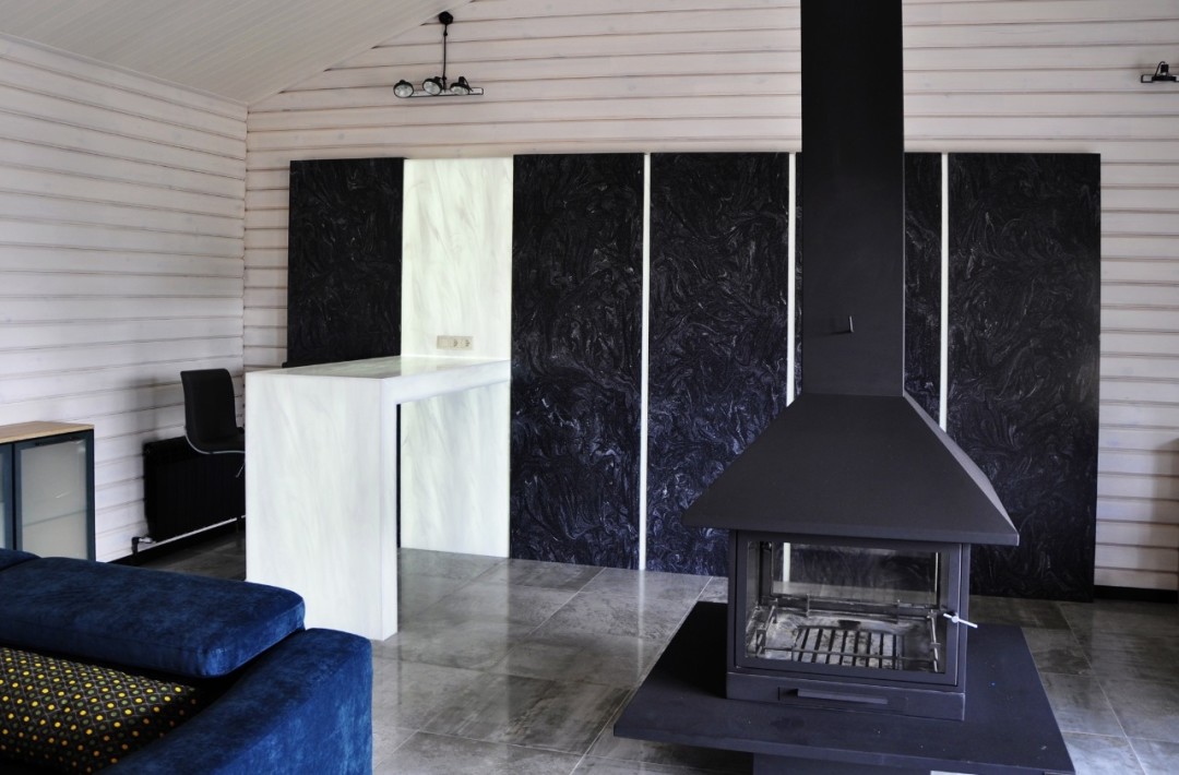 С помощью фрезеровки на ЧПУ с обратной стороны искусственного камня можно нанести любой рисунок. В выключенном состоянии стеновая панель будет выглядеть как гладкое полотно.
