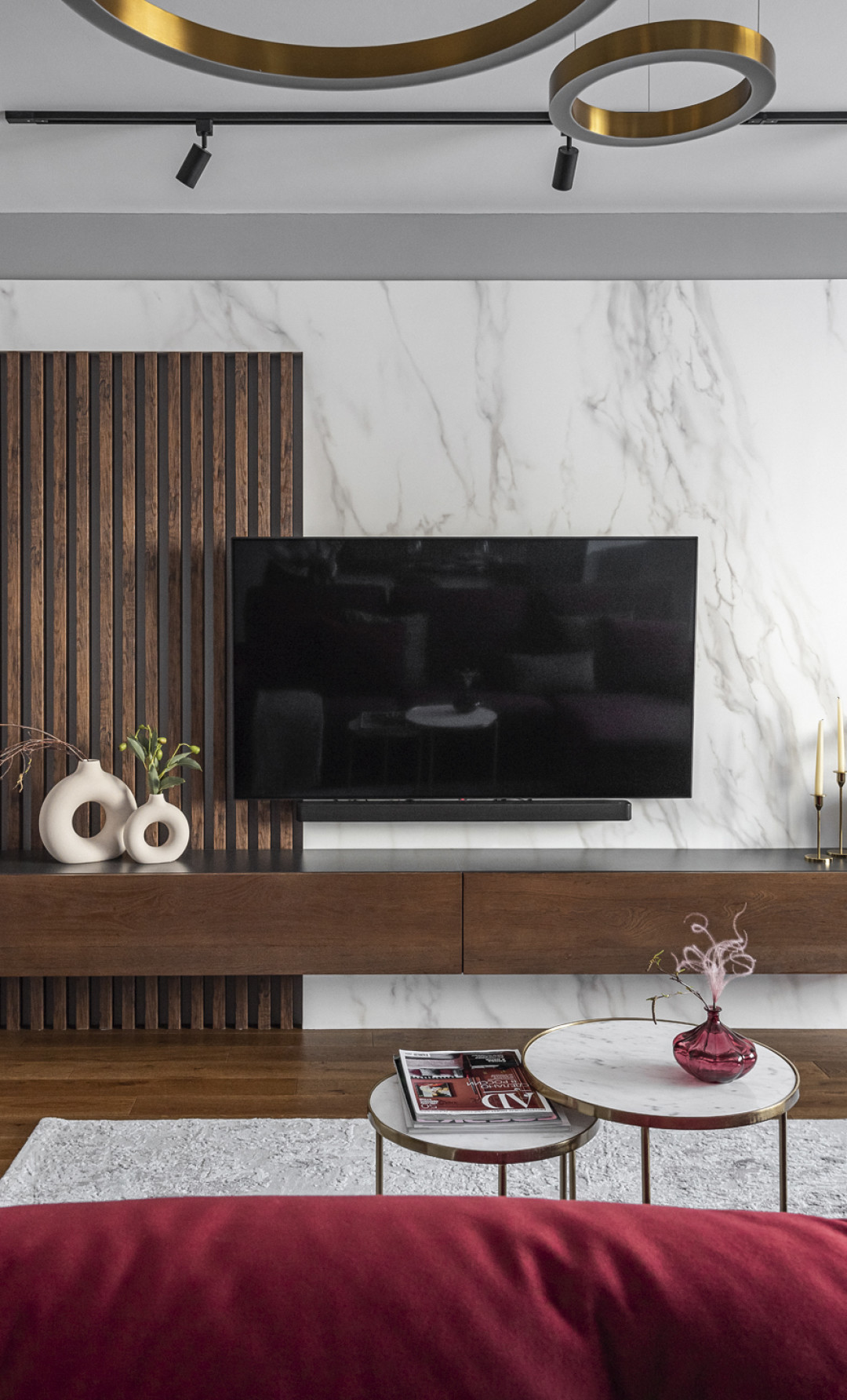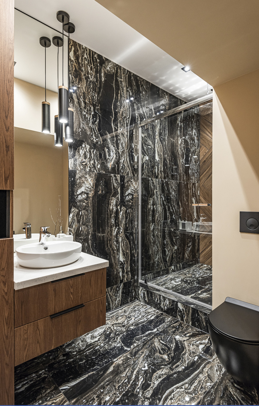 Владельцам очень понравился темный паркет и черный керамогранит в ванной. Общее пространство – прихожую, кухню-гостиную – мы оформили в темных тонах. Приватные зоны – спальню и детскую – сделали светлыми. В квартире были использованы краски итальянского завода и штукатурка в зоне ТВ, имитирующая мрамор.
