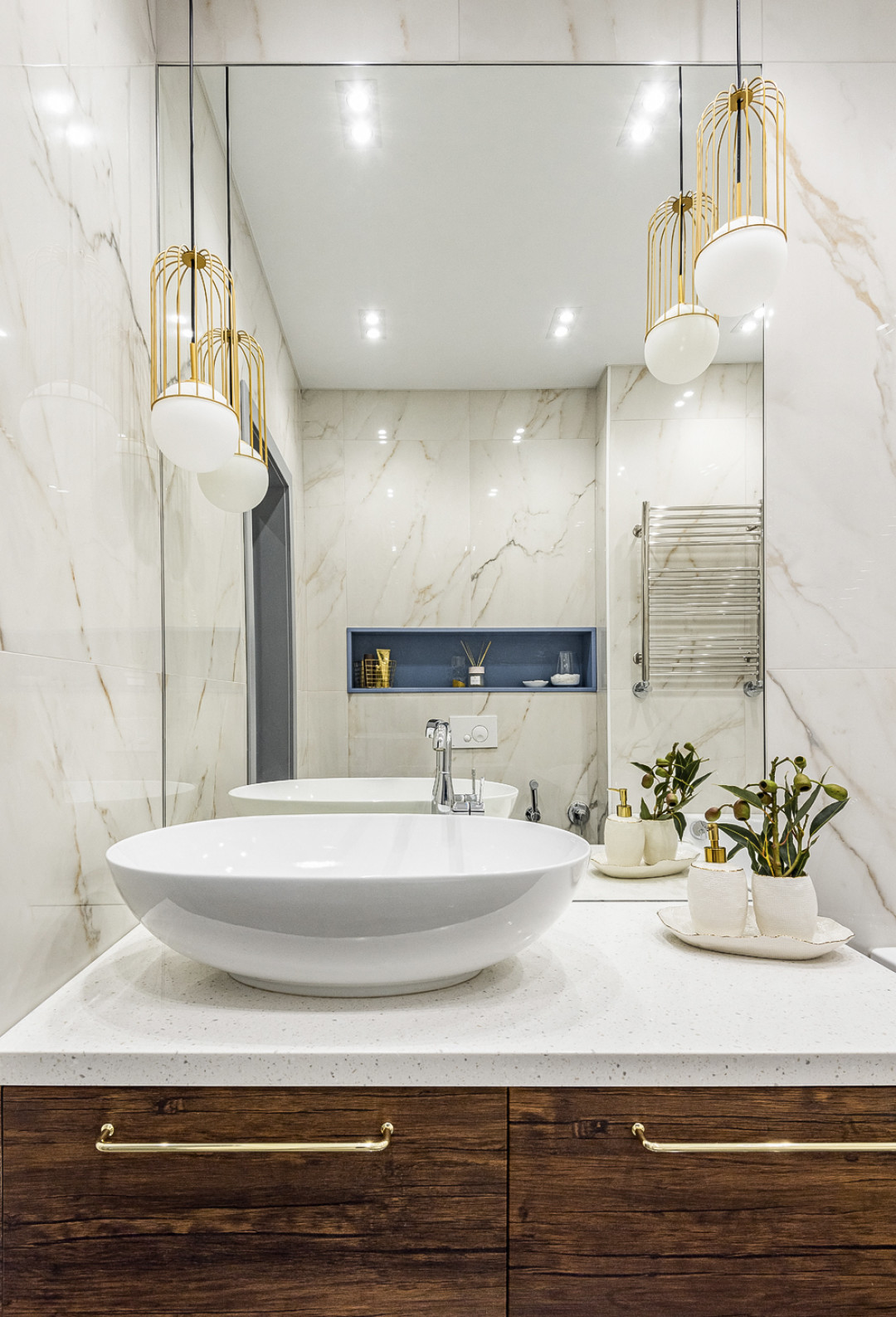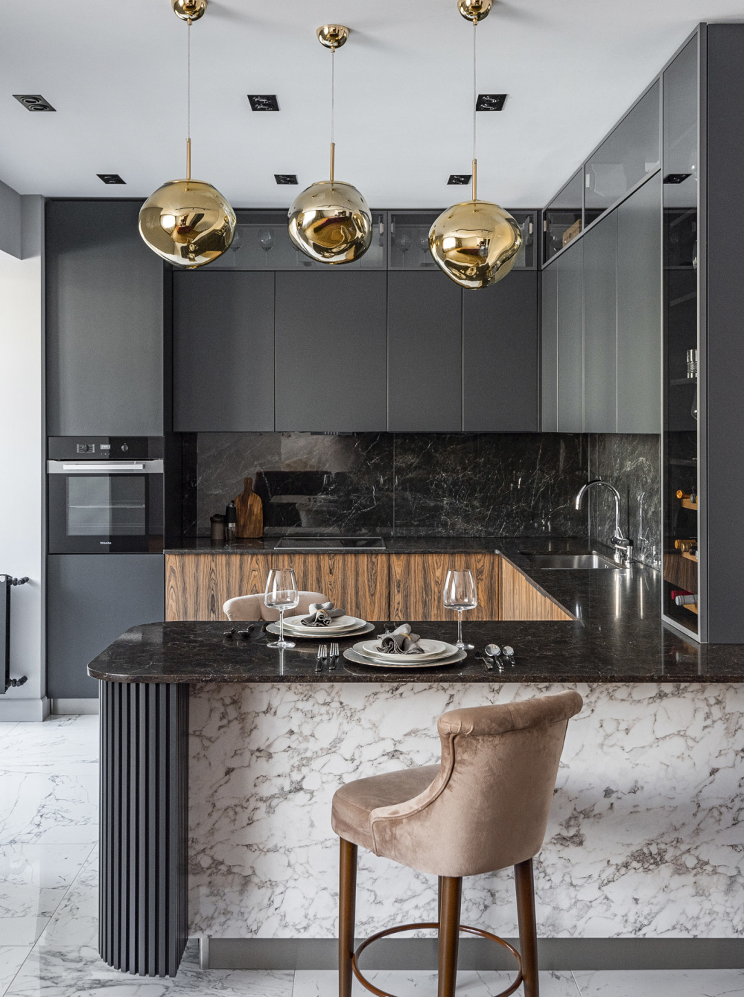 Мы начали с перепланировки: объединили кухню с гостиной, чтобы визуально увеличить пространство. На кухне разместили полуостров, за которым хозяева обедают. Он расположен таким образом, что с обоих сторон можно поставить стулья и сидеть лицом к лицу. Затем приступили к дизайн-проекту. Клиенты много путешествуют, поэтому в качестве референса мы взяли интерьеры дорогих гостиниц: использовали обилие мрамора, монохром с золотыми акцентами. Сюда отлично вписался диван, выполненный на заказ.