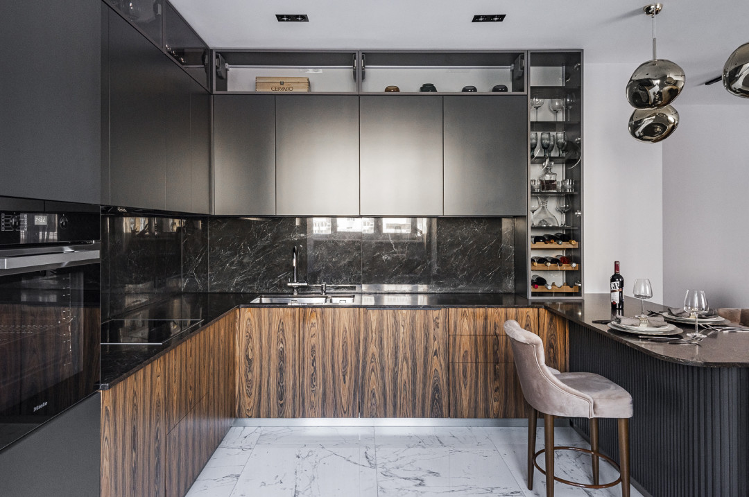 Трехкомнатная квартира площадью 115 метров находится в центре Уфы. Больше десяти лет она стояла пустой, с черновой отделкой. Заказчики – молодая пара с ребенком. Выходные они проводят в загородном доме: встречаются там с друзьями, принимают гостей. По задумке квартира должна была стать пространством для спокойных семейных будней – местом, куда редко попадают посторонние. Этим обусловлены особенности дизайна: например, в проекте нет большого обеденного стола, его заменяет барная стойка.