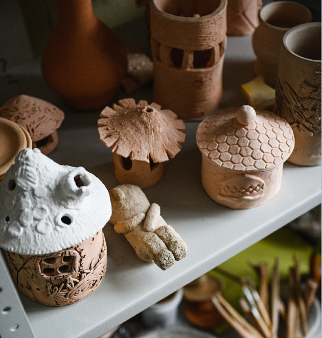 Глина, печь, кисть и вода. Вот вам и четыре стихии – земля, вода, воздух и огонь. Раньше глину мы сами рыли, сами сушили и отминали. Сейчас я покупаю готовую – украинскую, немецкую или испанскую. Глазурь, как и глиняные массы, заказываю в интернете или покупаю в специализированных магазинах. Для работы с фактурой идет все разнообразие подручных средств – палки, «каталки», «тыкалки», ножи и карандаши. У меня долго не было печи, и сначала мне помогали Константин Васин и его студия «Терракота», куда я возила изделия на обжиг. А потом муж подарил мне настоящую профессиональную печь, о какой я всегда мечтала. И я стала работать дома, на кухне.