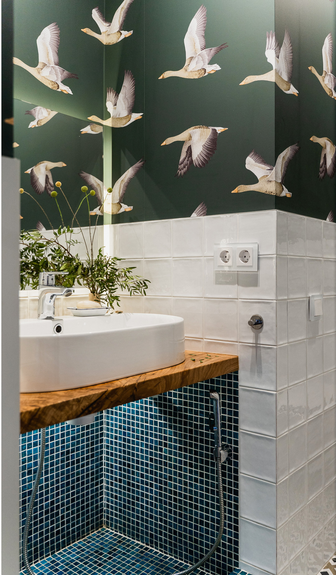 Для шоколадного лабрадора установили специальную душевую. С прогулки собаку проводят по плитке в гостевой санузел, где и находится специальный поддон с гигиеническим душем, вымощенный мозаикой, для мытья лап. Всю сантехнику для креативного проекта подобрали в одной студии. А в дизайн-бутике – эстетичную плитку в гостиную, прихожую, кухню, лоджию, ванную и гостевой санузел.