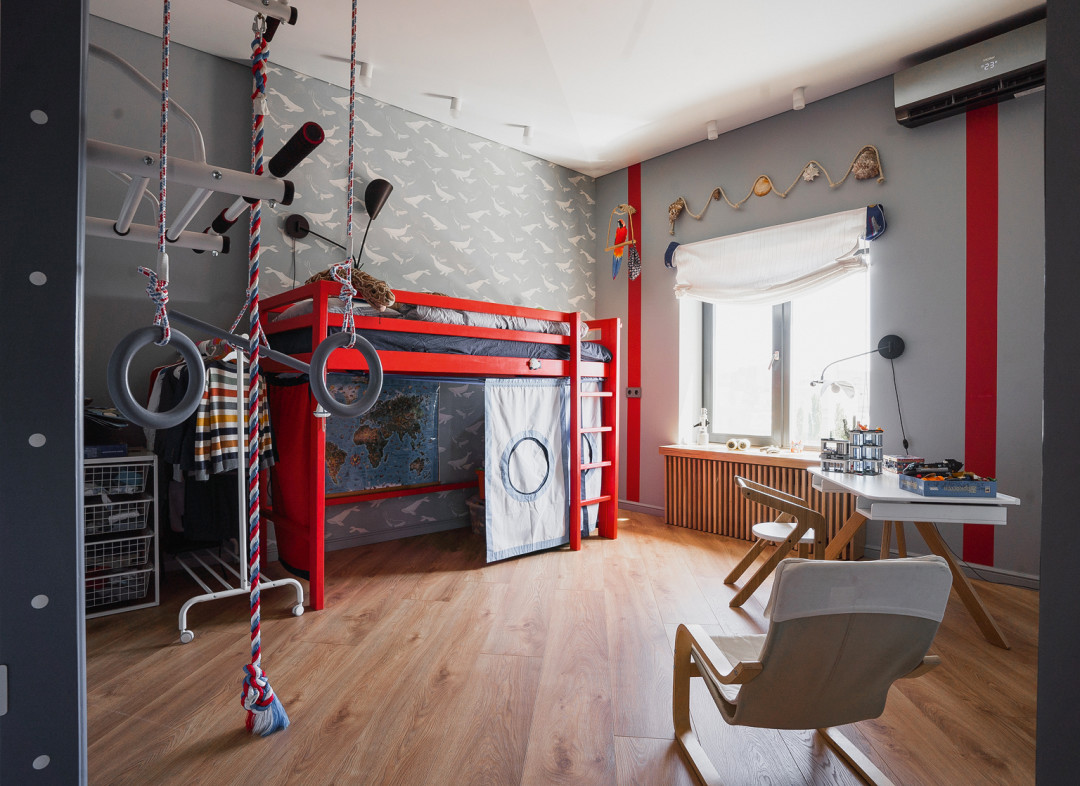 В квартире площадью 129 квадратных метров дизайнер постаралась вместить все, что может понадобиться семье с двумя детьми и шоколадным лабрадором: родительская спальня, детская-гостиная, две отдельные детские комнаты, подсобное помещение (постирочная), объединенная кухня-гостиная, ванная комната, гостевой санузел и лоджия. Одним словом – простор получил каждый член семьи.