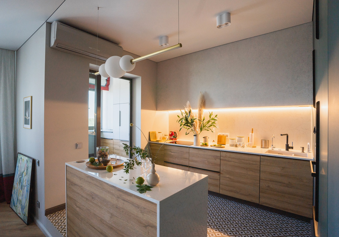 Также есть харизматичные элементы интерьера: шкаф на лоджии выступил продолжением шкафа на кухне, по одной линии деревянные фасады снизу и сверху более светлые – создается иллюзия продолжения кухни. Так как квартира находится на техническом этаже, вся геометрия сложная, мебель нужна была необычная. Эстетичный и изысканный материал для кухонной столешницы, фартука и подоконника на лоджии выбрали в одной компании. Ламинат – европейского качества.